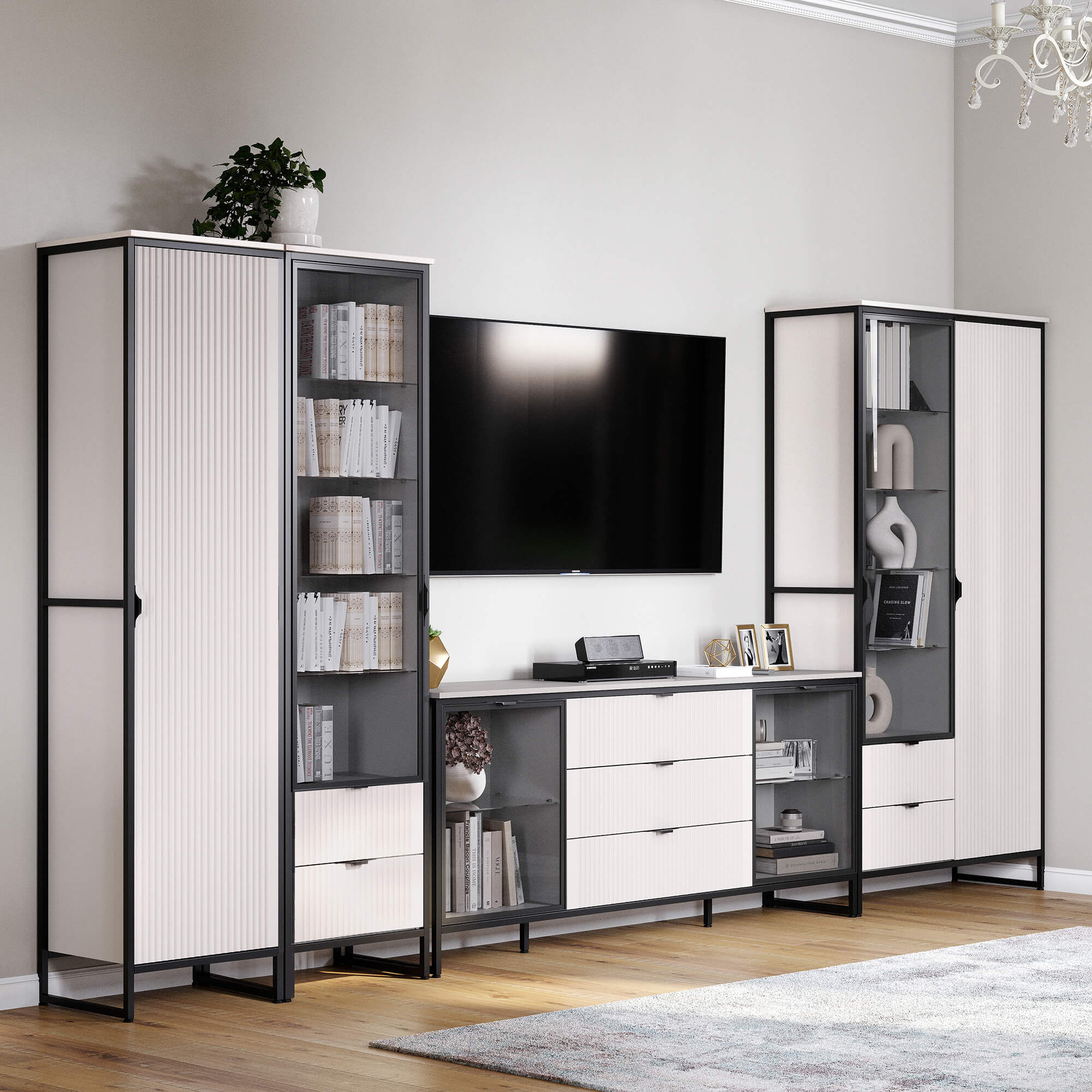 Коллекцию модульной гостиной "Нора" отличает современный оригинальный стиль. Декоративная продольная фрезеровка на фазадах из МДФ и опоры на металлокаркасе соответствуют модным тенденциям этого года в ведущих зарубежных коллекциях.