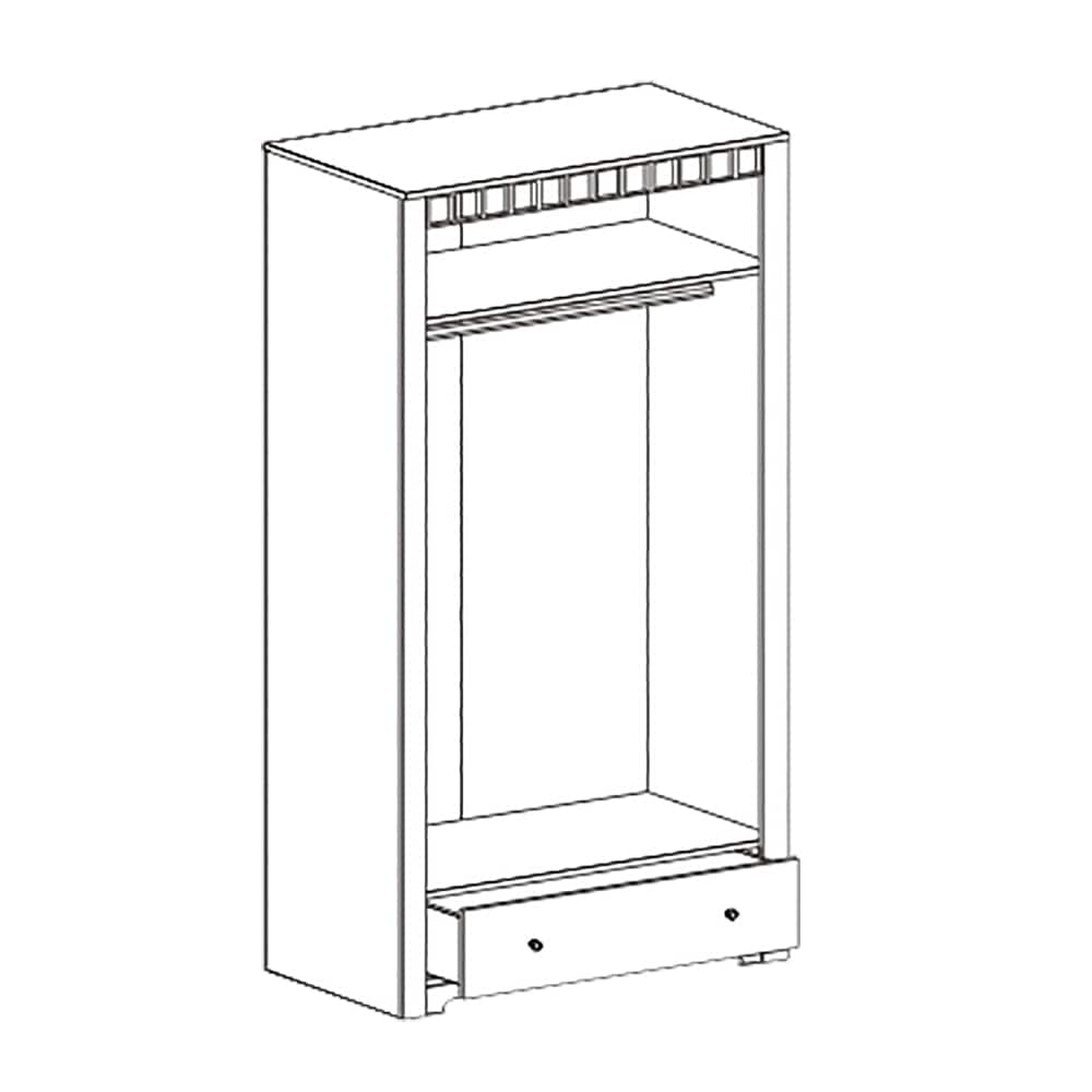 В шкафу расположены две распашные двери и в нижней части ящик на шариковых направляющих глубиной 500 мм. За распашными дверьми расположено отделение для одежды со стальной штангой.