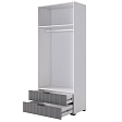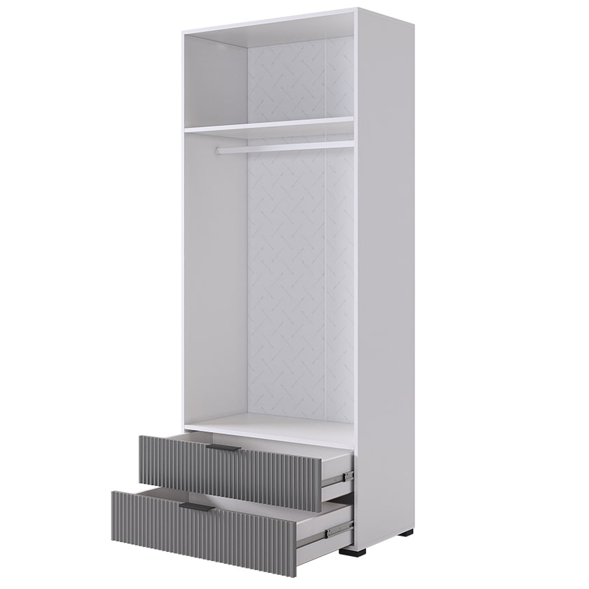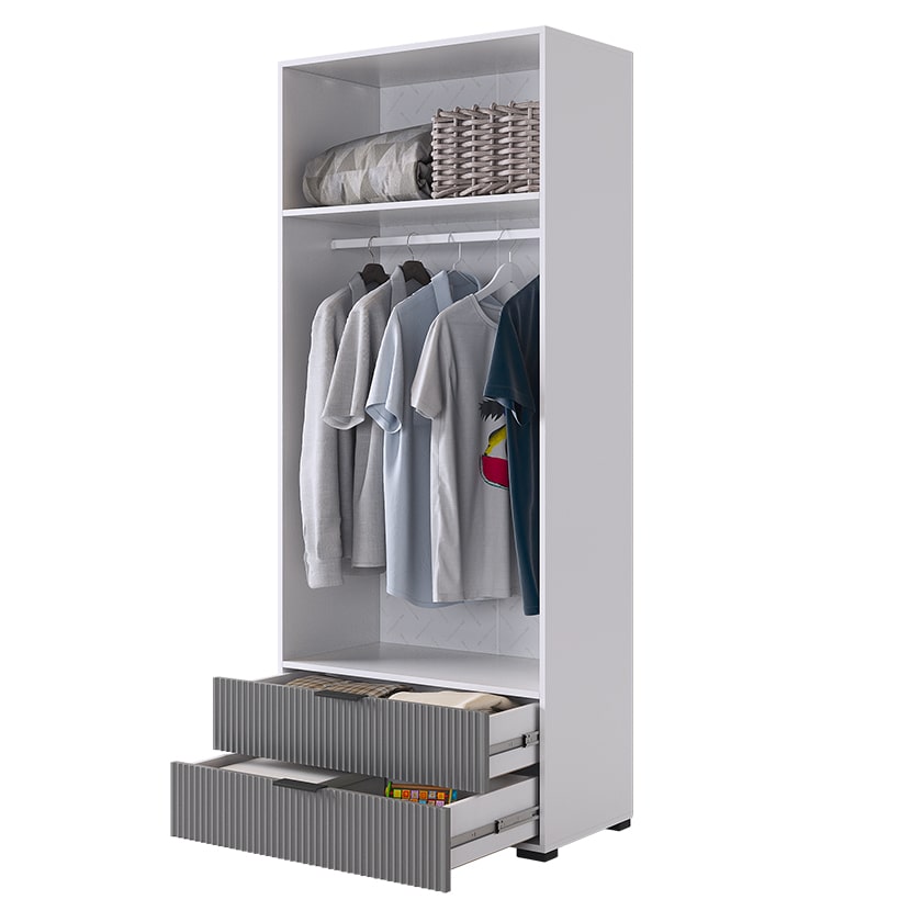 - Внутри шкафа вы найдете штангу для одежды, полки.А также два удобных ящика с шариковыми направляющими.