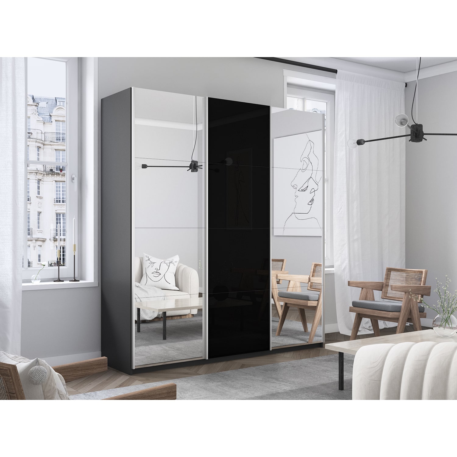 Шкаф-купе 3-х дверный Прайм Медиум Черное стекло/2 зеркала 2300х2100х570 мм, материал корпуса - ЛДСП. Производитель - Е1. Шкафы-купе Прайм – это качественные модели с оригинальными и современными фасадами. Идеальное решение для Вашего гардероба! Внутри имеются вместительные полки для складирования сложенных вещей, антресоли и секция для размещения одежды на плечиках. С таким количеством мест для хранения вы можете рассортировать вещи и поддерживать идеальный порядок в шкафу. Прочная система направляющих прослужит долгие годы. При изготовлении шкафов-купе используются только экологически безопасные материалы, благодаря чему Вы приобретаете добротную корпусную мебель, соответствующую европейскому уровню качества. Шкаф-купе 3-х дверный Прайм Медиум Черное стекло/2 зеркала 2300х2100х570 мм доступен к заказу в различных вариантах исполнения цвета фасада и корпуса, среди которых каждый сможет найти подходящий своему интерьеру. Оформите заказ на сайте или свяжитесь с нами для уточнения деталей.