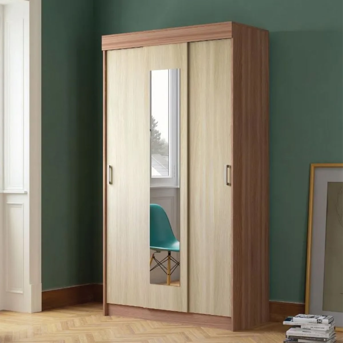 Зеркало в центре: шкаф оборудован зеркалом, что позволяет видеть себя в полный рост и контролировать свой внешний вид.
