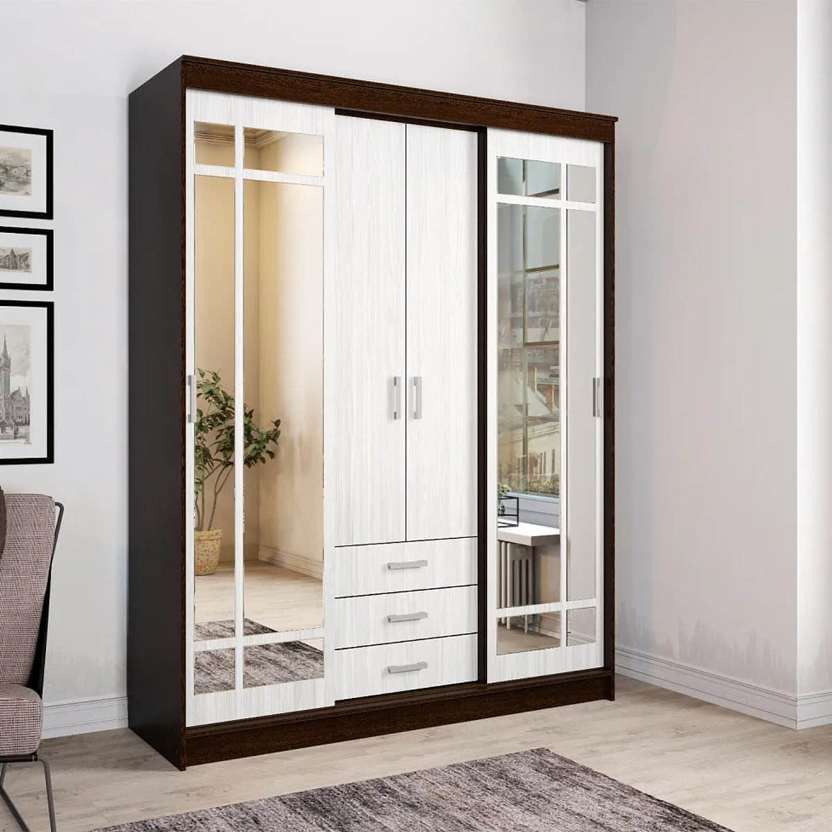 Выглядит немного необычно на фоне других шкафов-купе. Понравилась идея с зеркалами. Устроила цена.