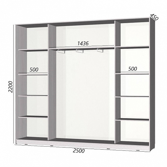 Шкаф-купе серии «Старт» 2500 - подойдет даже самой активной моднице, или же семейству из нескольких человек. Его длина 2,5 метра! Благодаря продуманной конструкции внутреннего наполнения сюда поместиться больше по сравнению с аналогичными конструкциями.
