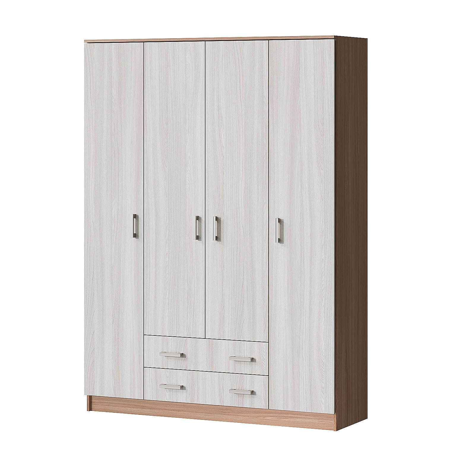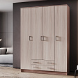Шкаф оснащен четырьмя распашными дверями, что обеспечивает удобный доступ к содержимому. Внутри шкафа расположены девять полок, а также две секции с ящиками для хранения мелких предметов.