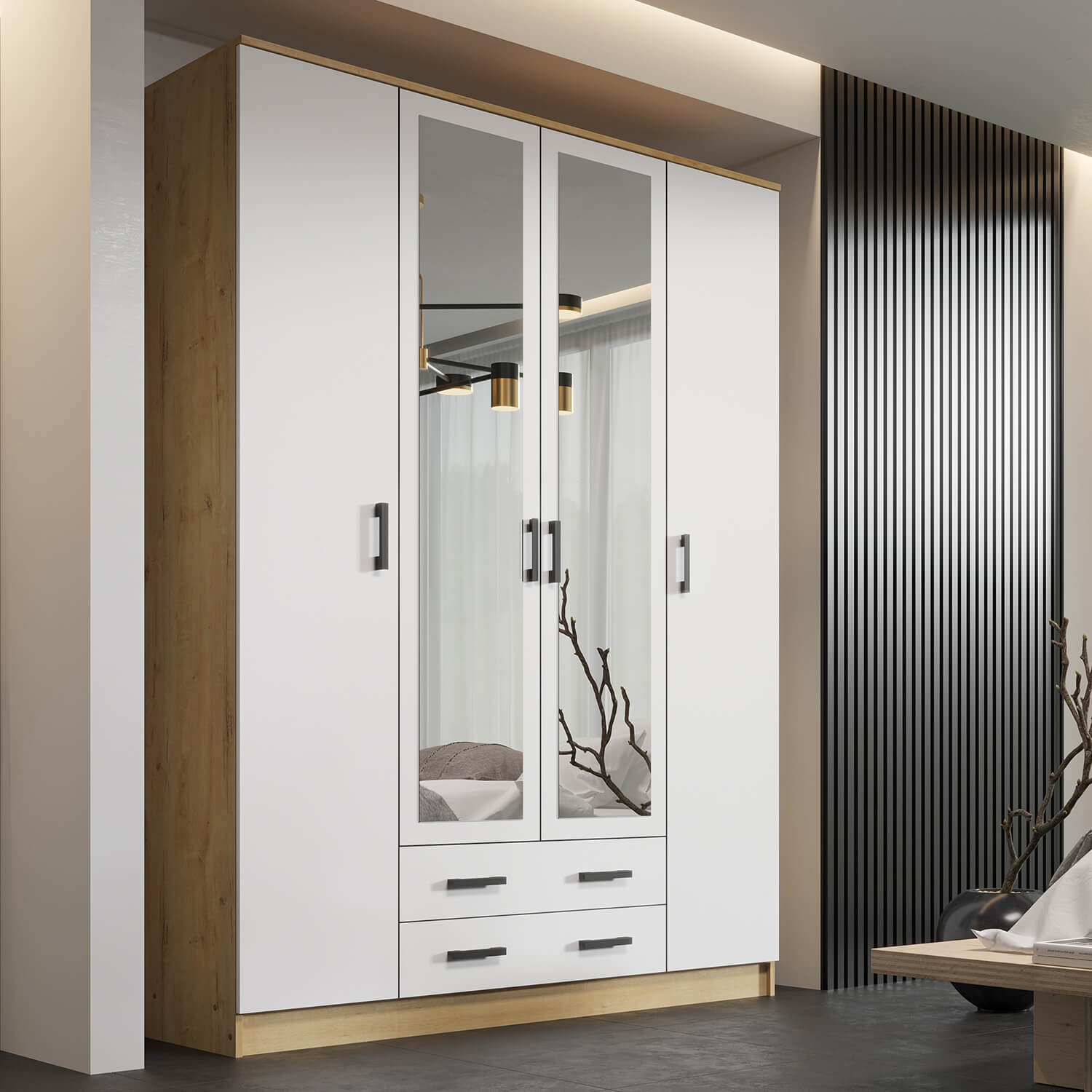 Шкаф оснащен четырьмя распашными дверями, штангой для вешалок и двумя зеркалами. Это обеспечивает удобный доступ к вещам и позволяет видеть себя в полный рост.