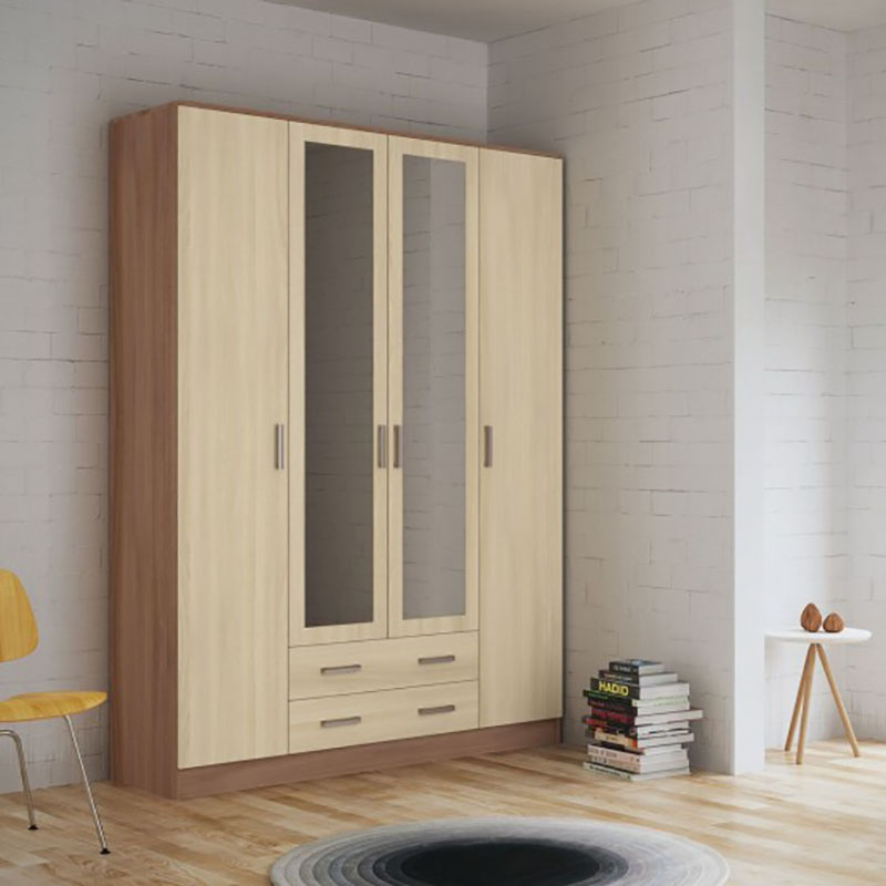 Шкаф оснащен четырьмя распашными дверями, что обеспечивает удобный доступ к содержимому. Внутри шкафа расположены девять полок, а также две секции с ящиками для хранения мелких предметов.