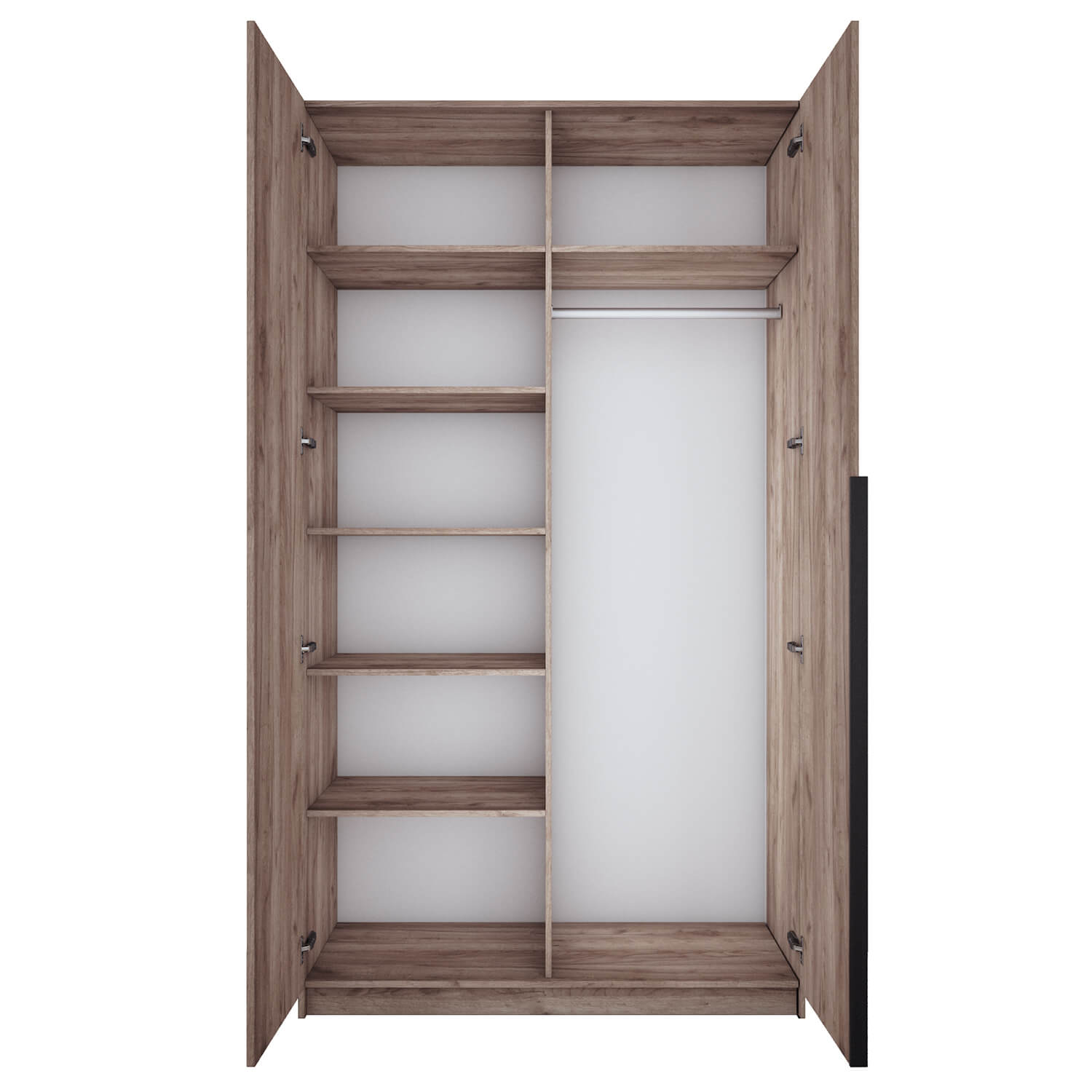 Шкаф оснащен долговечной, ударостойкой кромкой ПВХ, которая защищает его торцы от сколов и повреждений. Мебельные петли Titus B-Type обеспечивают открывание и закрывание двери под углом 110 градусов, а также предотвращают ее перекос. Шкаф оснащен удобной минималистичной ручкой, изготовленной из алюминия.