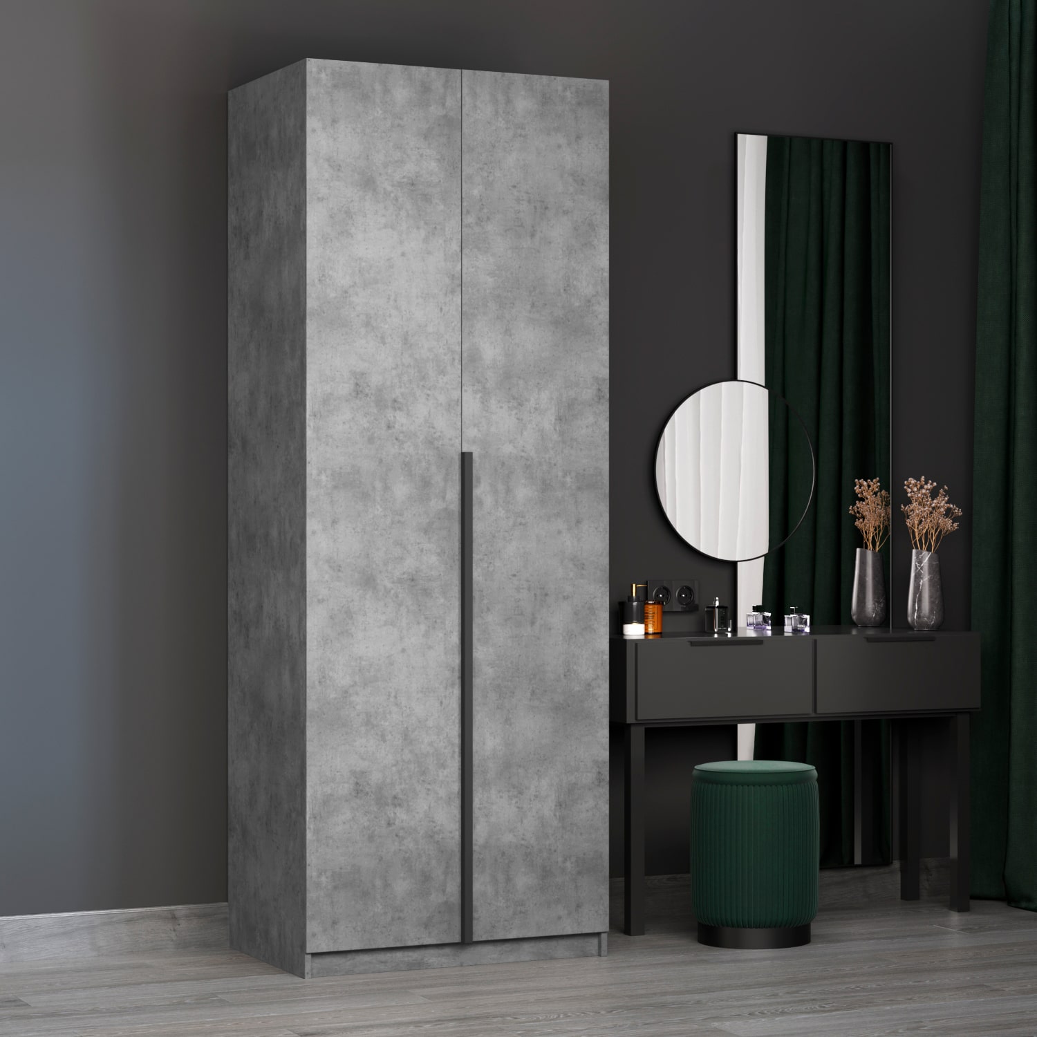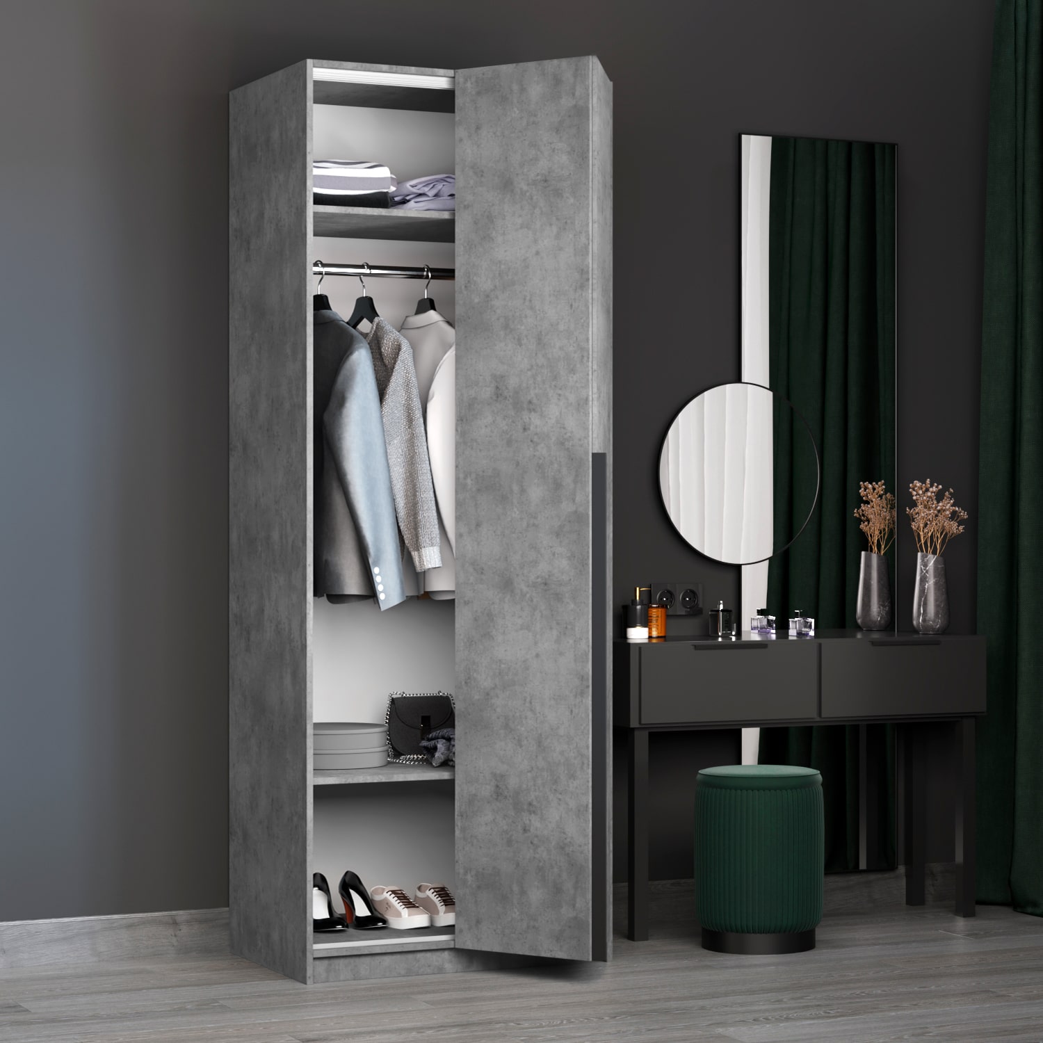 Шкаф оснащен долговечной, ударостойкой кромкой ПВХ, которая защищает его торцы от сколов и повреждений. Удобная минималистичная ручка, изготовленная из алюминия.
