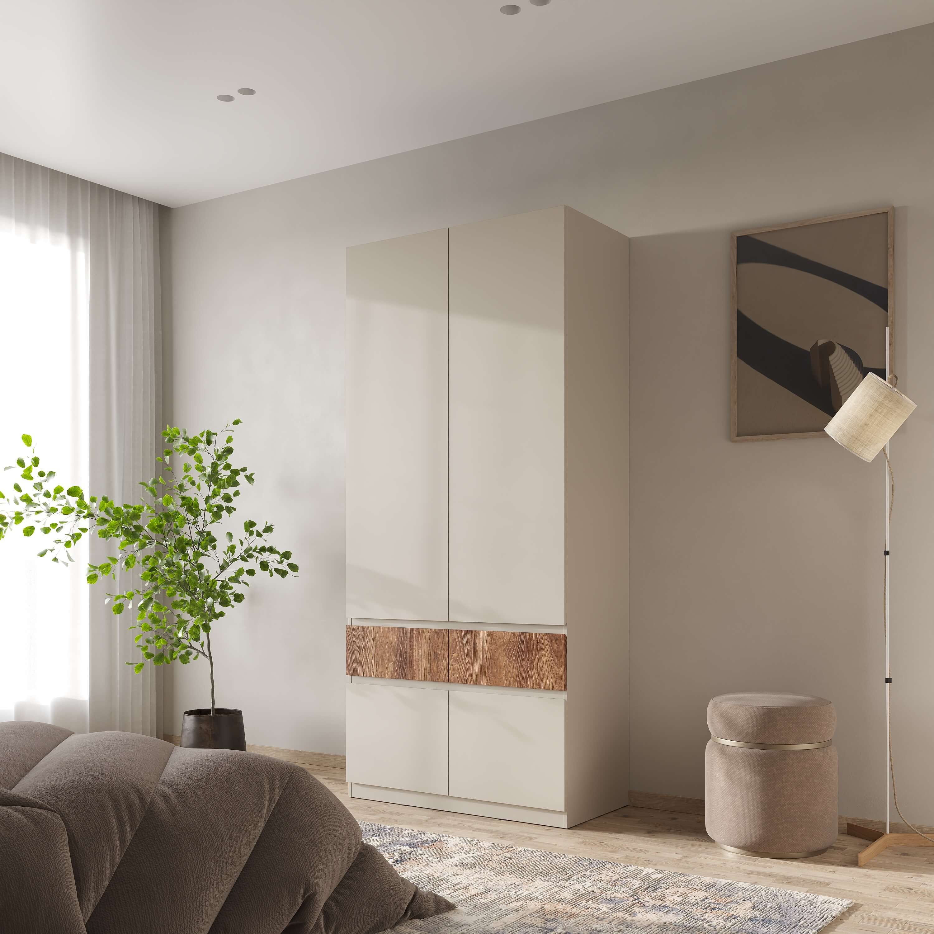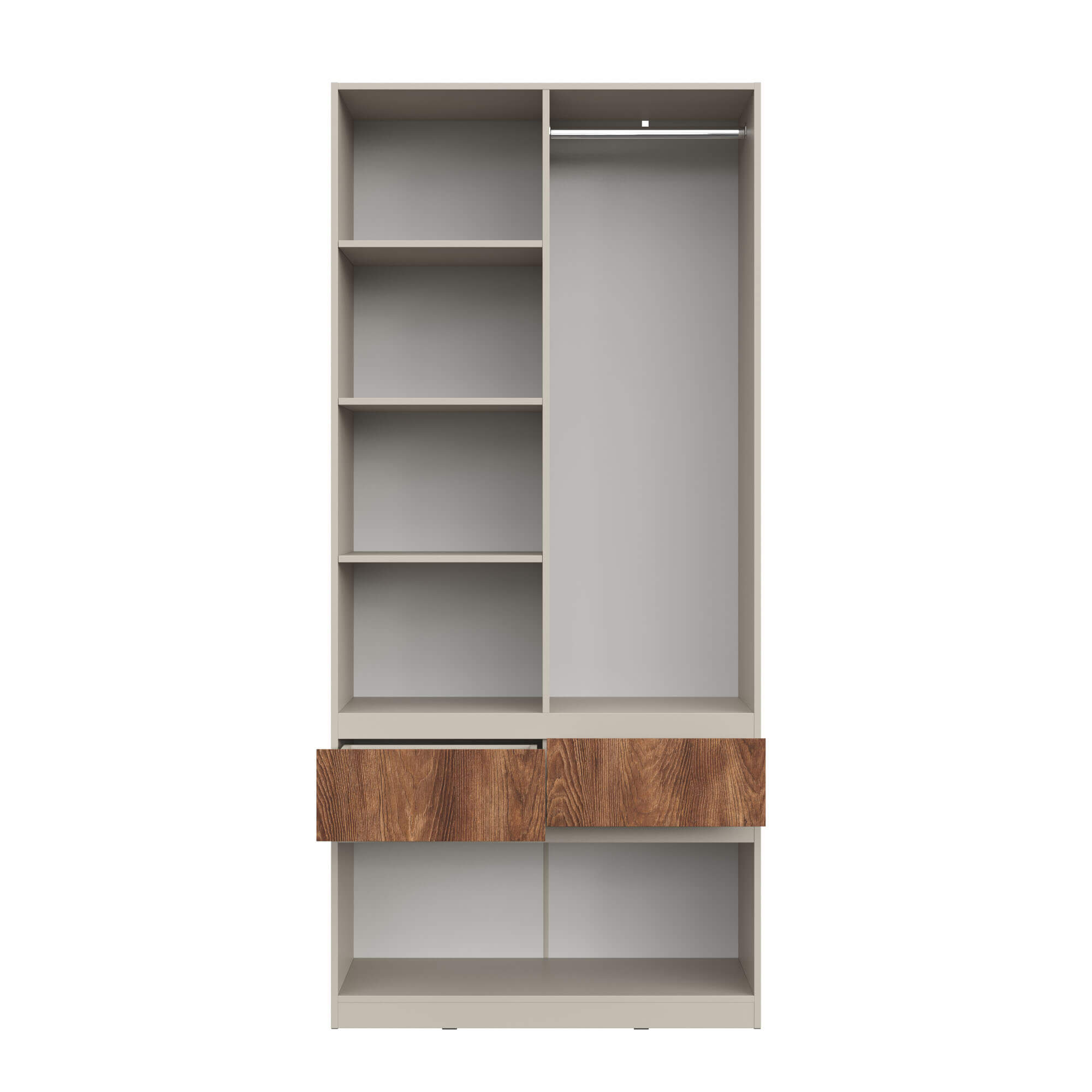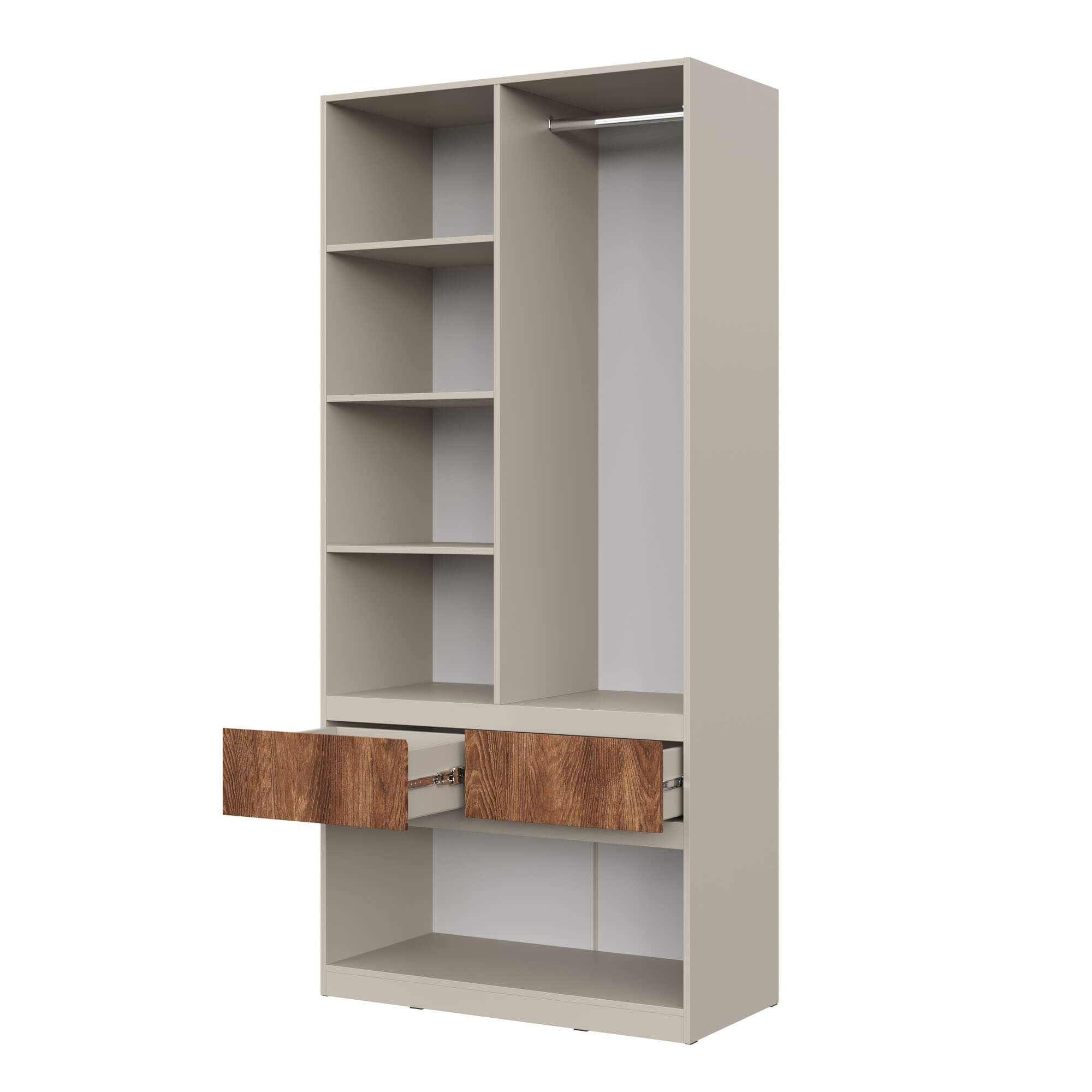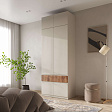 Функциональность: внутреннее пространство шкафов включает полки для одежды, полноценную штангу, ящики для мелочей и отдельные ниши под обувь, что позволяет эффективно организовать хранение.