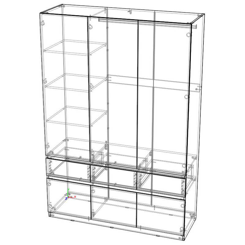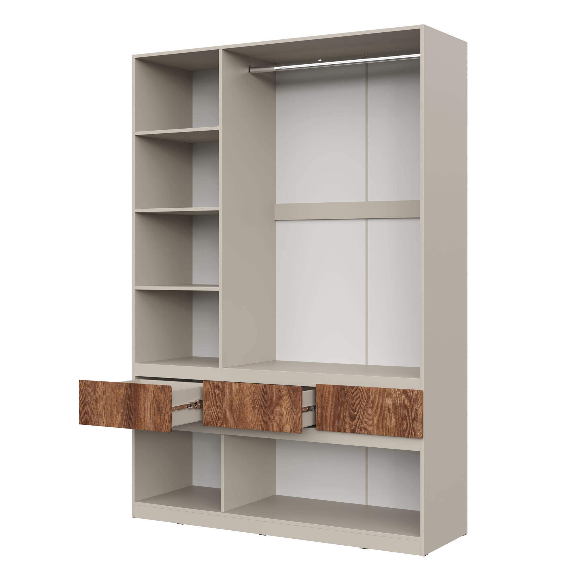 Функциональность: внутреннее пространство шкафов включает полки для одежды, полноценную штангу, ящики для мелочей и отдельные ниши под обувь, что позволяет эффективно организовать хранение.
