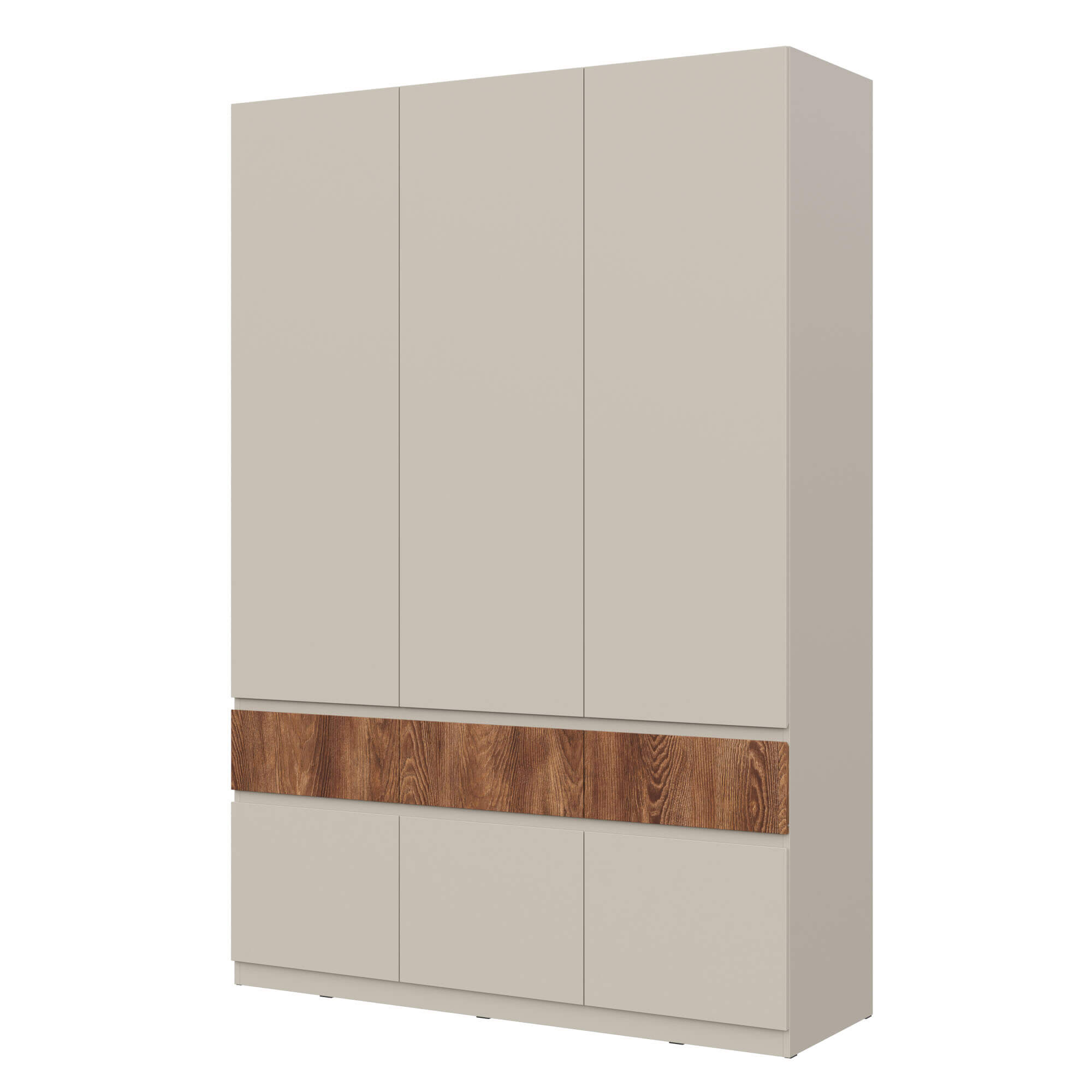 Элегантный дизайн: использование вставки на фасаде в цвете текстурного темного дерева каштан придает мебели уникальность, добавляя контраст.