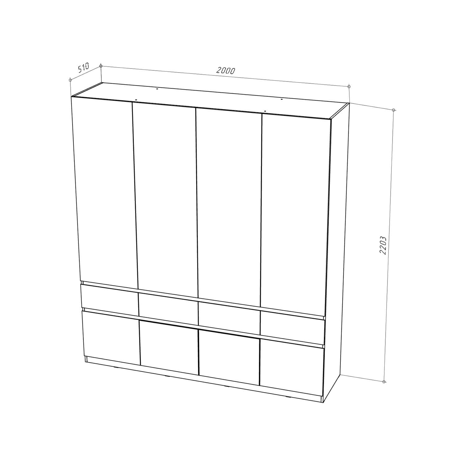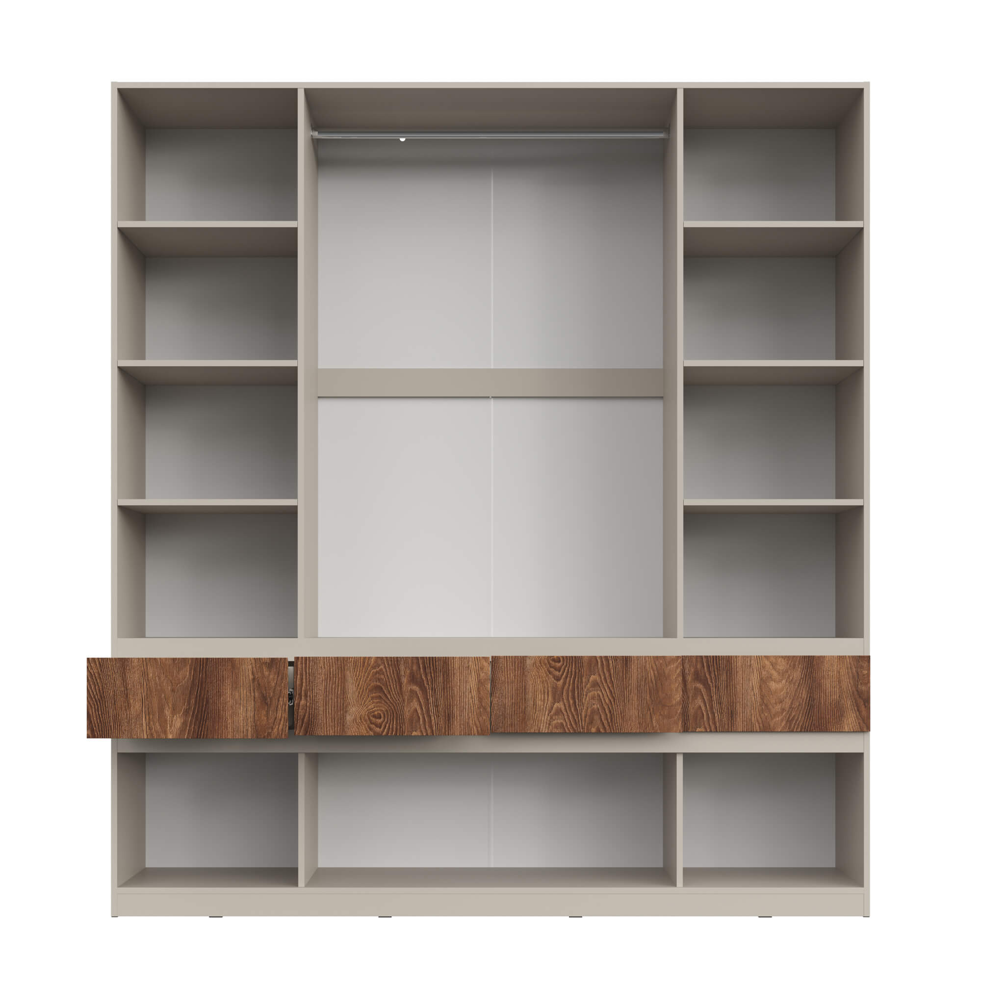 Функциональность: внутреннее пространство шкафов включает полки для одежды, полноценную штангу, ящики для мелочей и отдельные ниши под обувь, что позволяет эффективно организовать хранение.