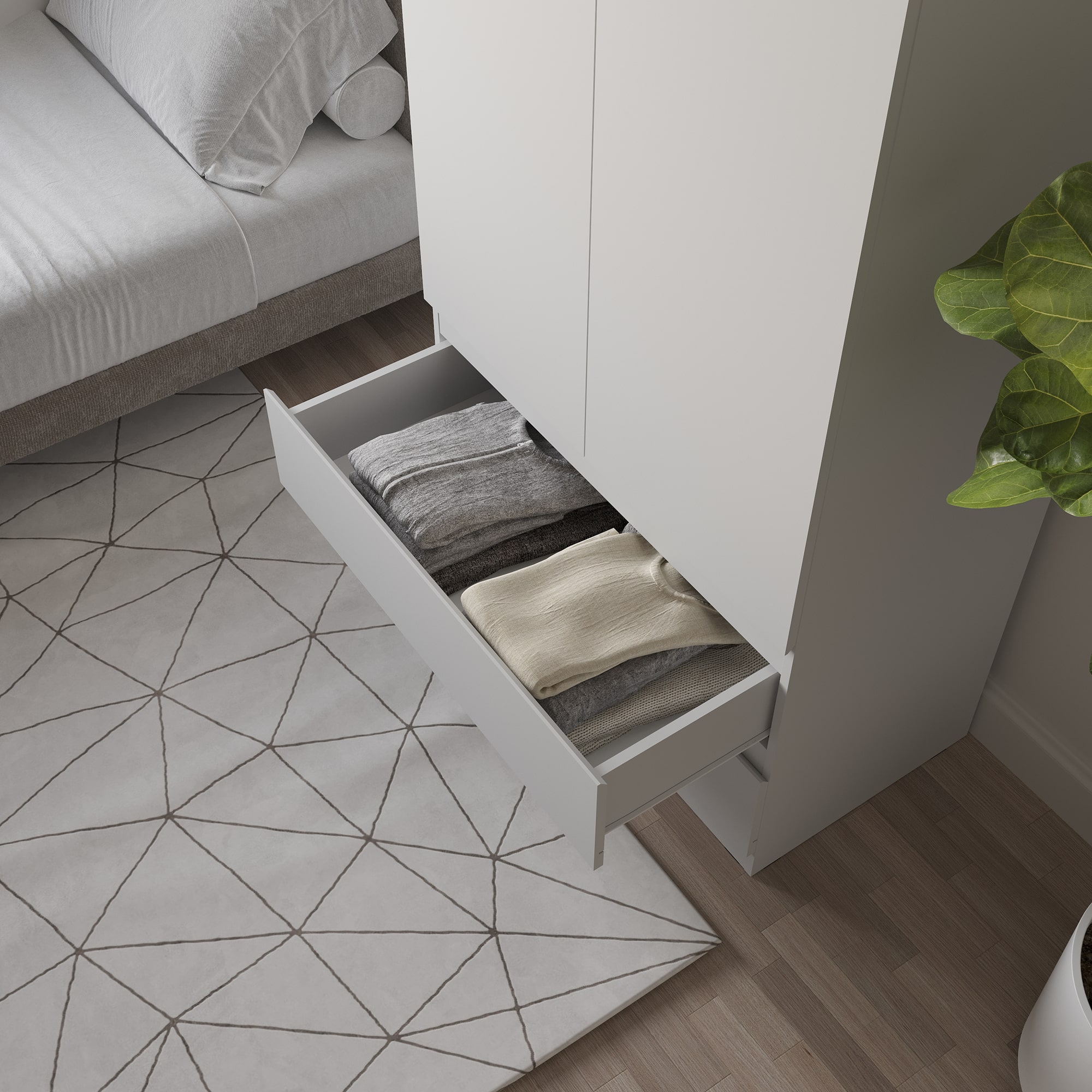 Дизайн шкафа STERN выполнен в стиле без лишних деталей, что делает его уместным в любой комнате. Удобные скошенные ручки на фасадах и модные цвета декоративной отделки придают шкафу современный и стильный вид.
