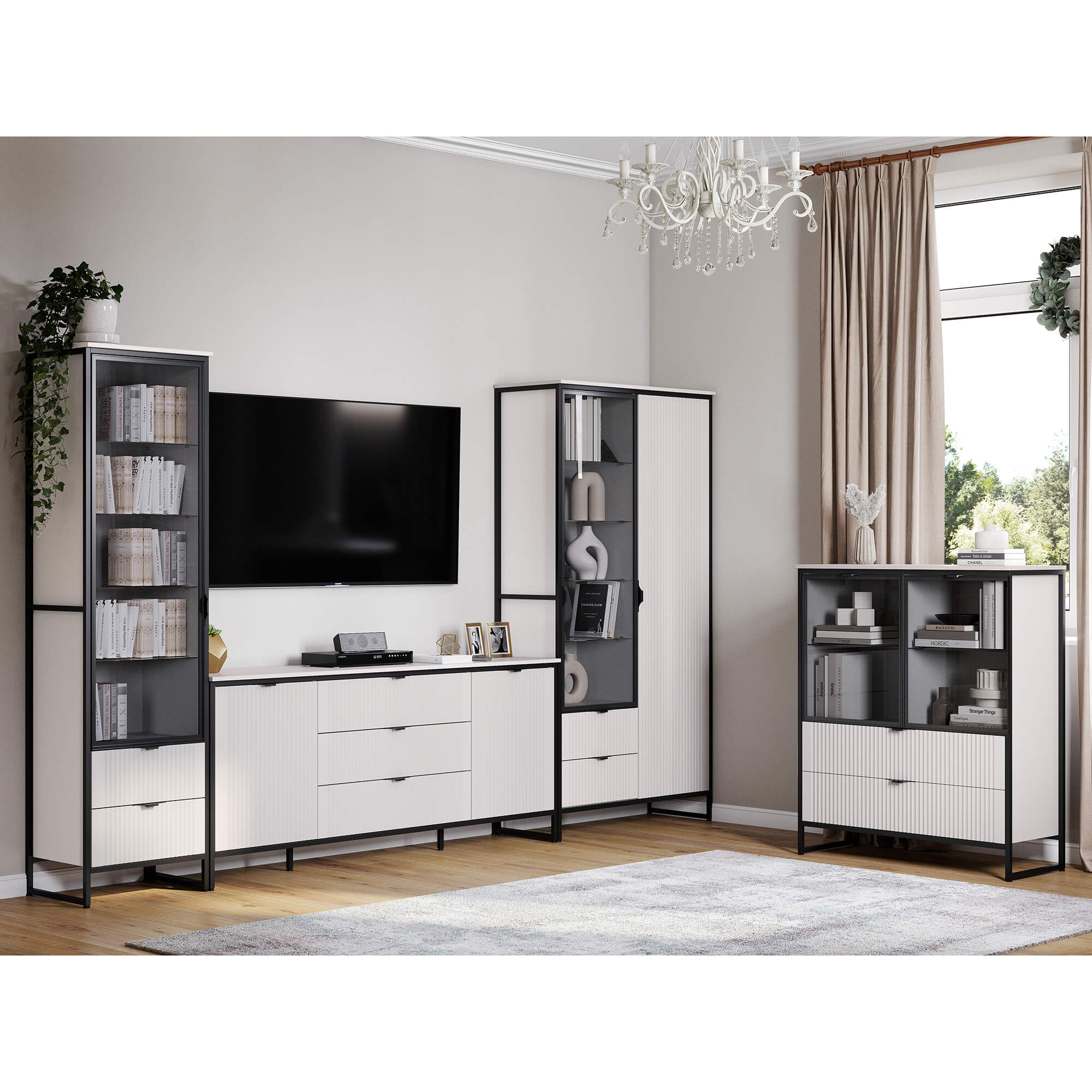 Коллекцию модульной гостиной "Нора" отличает современный оригинальный стиль. Декоративная продольная фрезеровка на фазадах из МДФ и опоры на металлокаркасе цвета соответствуют модным тенденциям этого года в ведущих зарубежных коллекциях.