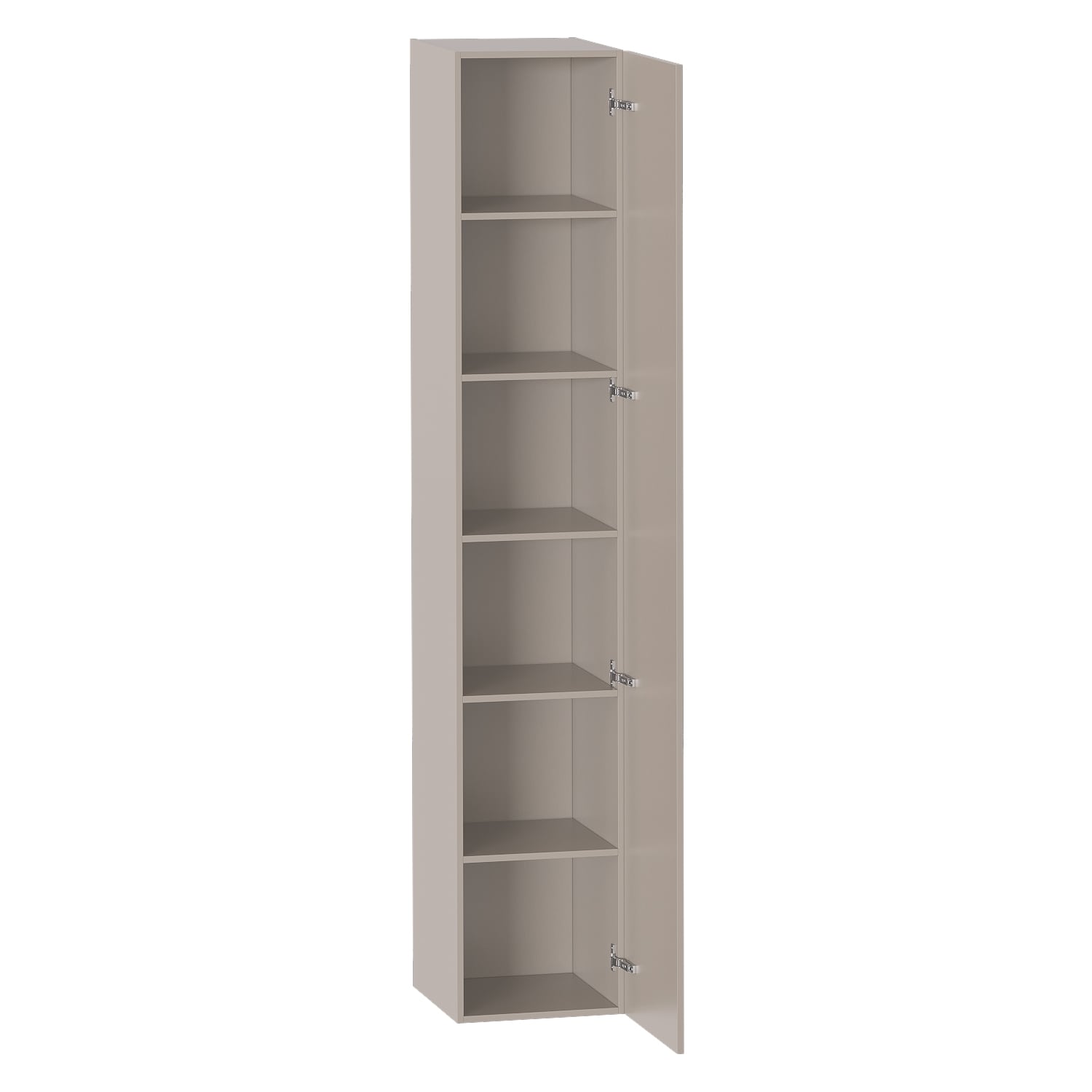 Шкаф однодверный выполнен из ЛДСП цвета Капучино и имеет 6 вместительных полок. Открывание двери возможно на левую и правую сторону. Ручки в форме скобы выполнены из белого матового металла. Все петли - плавного закрывания.