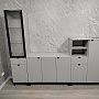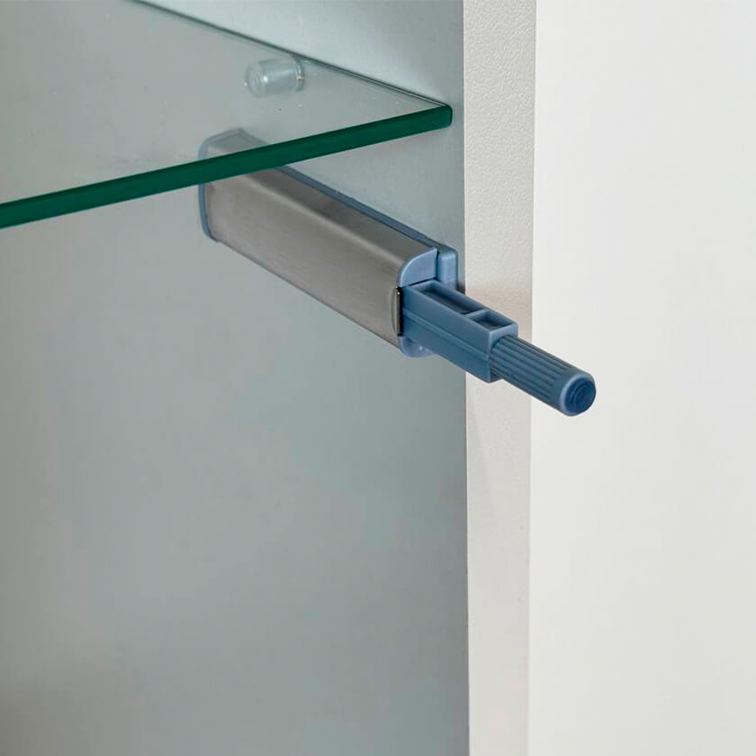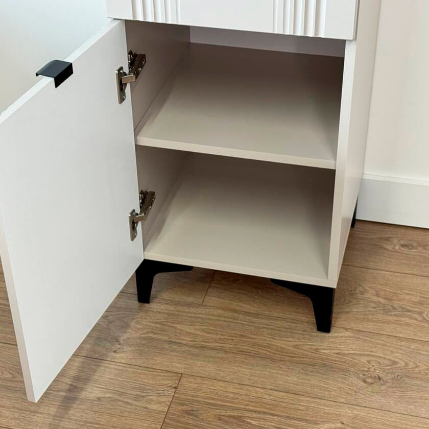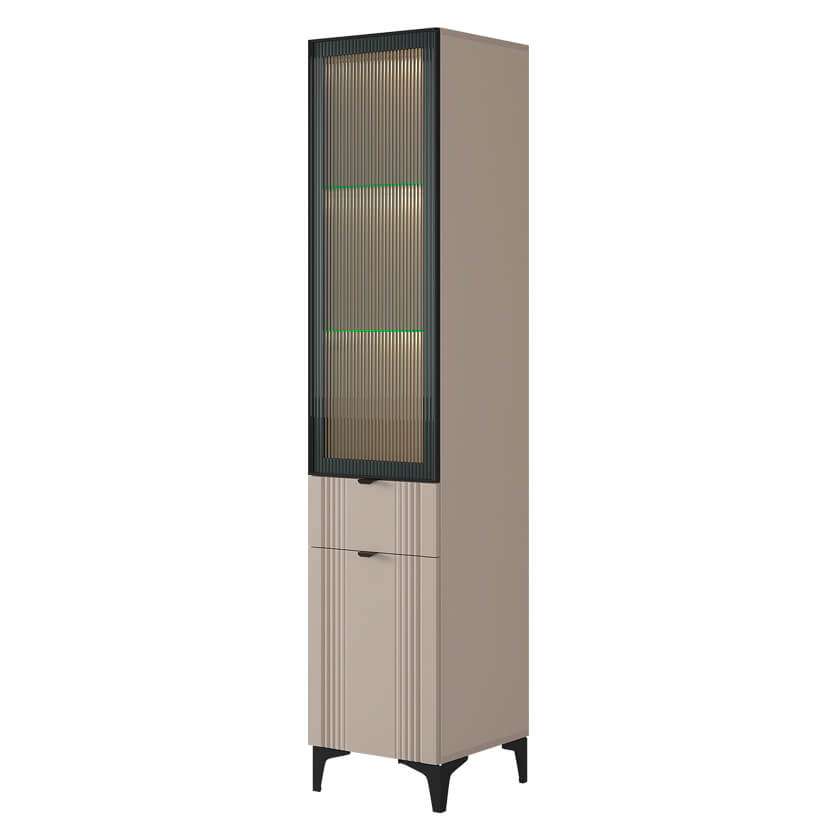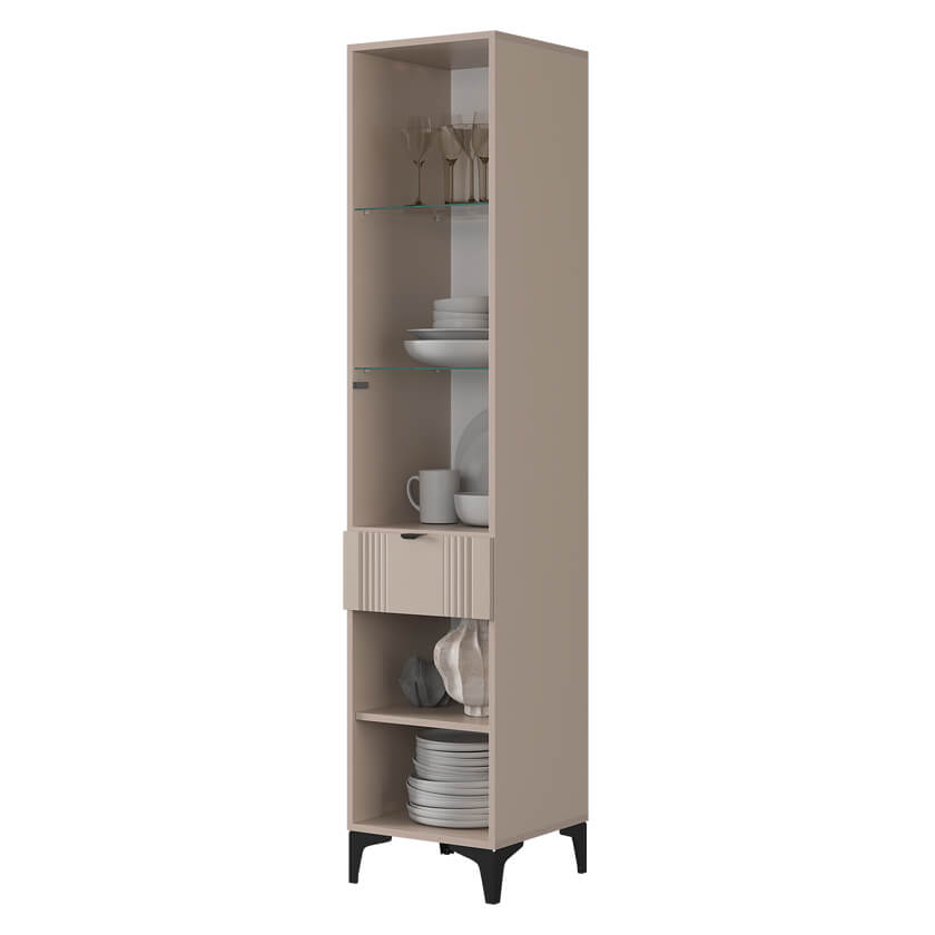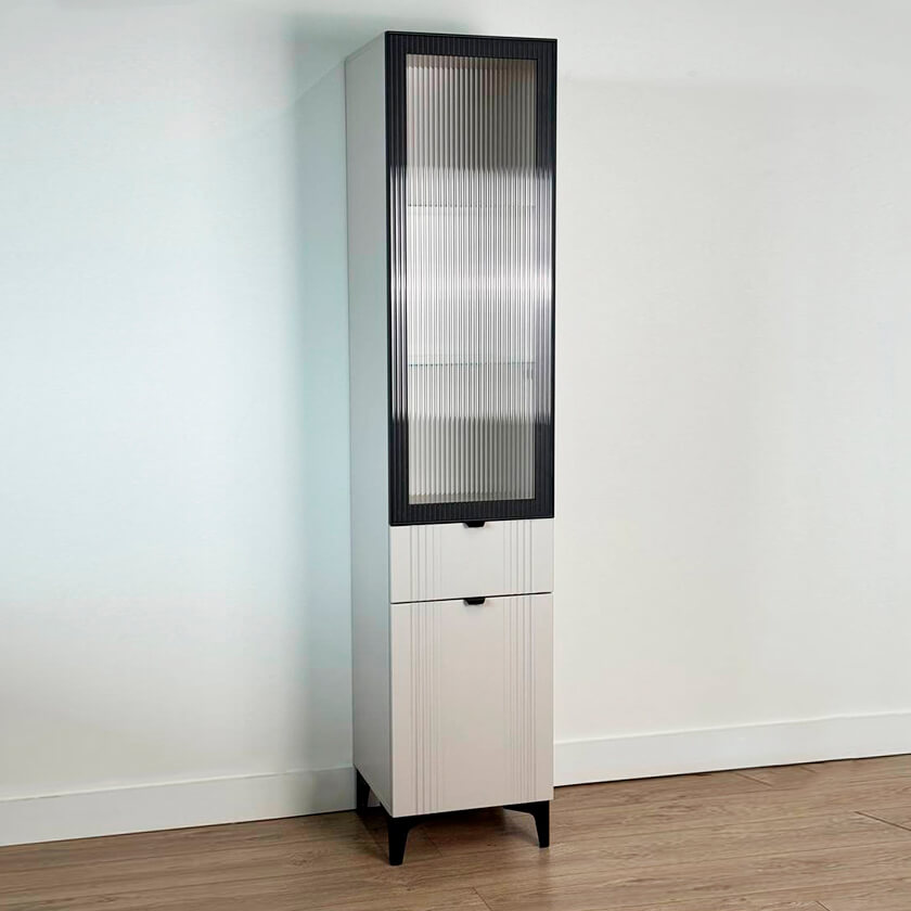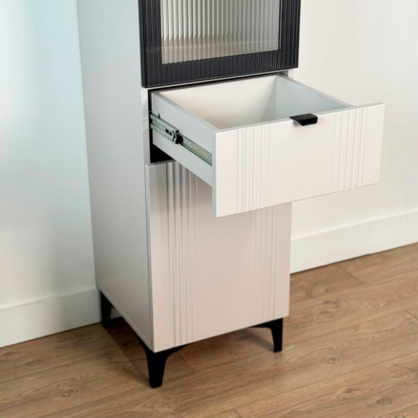 Шкаф оснащён надёжной металлической ручкой и имеет удобное внутреннее наполнение: надёжные полки за стеклянной и глухой дверцами, а также выкатной ящик. Это позволяет рационально использовать пространство.