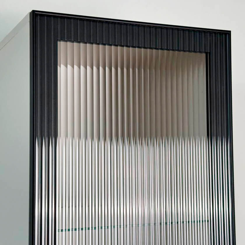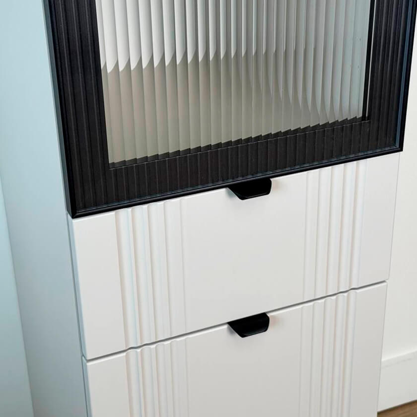 Корпус шкафа изготовлен из ЛДСП, что гарантирует прочность и долговечность. Фасад, покрытый МДФ в плёнке ПВХ, не только выглядит эстетично, но и защищает шкаф от повреждений. Особое внимание заслуживает фрезеровка фасадов, которая придаёт шкафу изысканный вид.