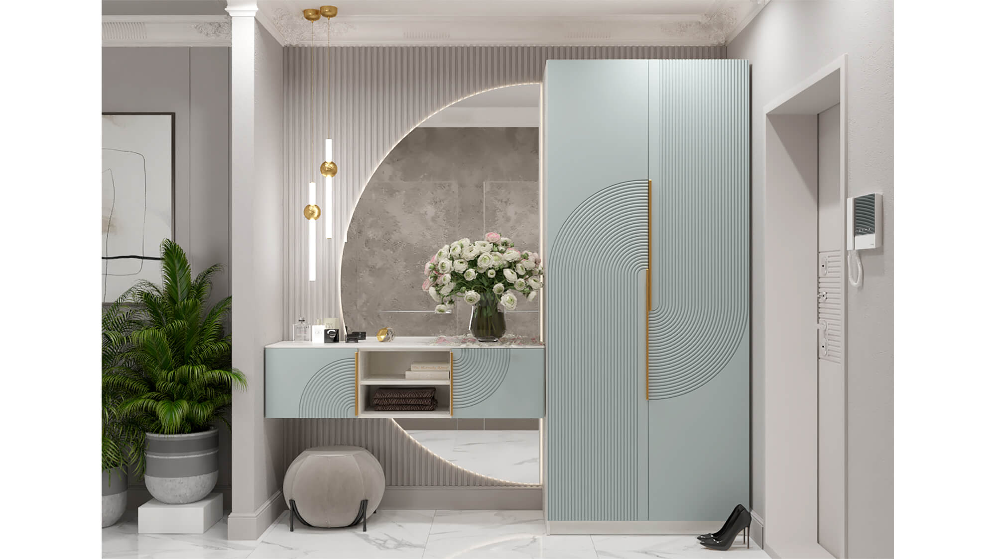 Дизайн серии построен на гармоничном сочетании натуральных оттенков и инновационных решений. Корпус выполнен из высококачественной ЛДСП в универсальном цвете “Дуб Харбор”, который прекрасно впишется в любой интерьер. Особую привлекательность фасадам придает эксклюзивная фрезеровка “Галактика” в благородном матовом оттенке Шарли бриз МАТ 151.