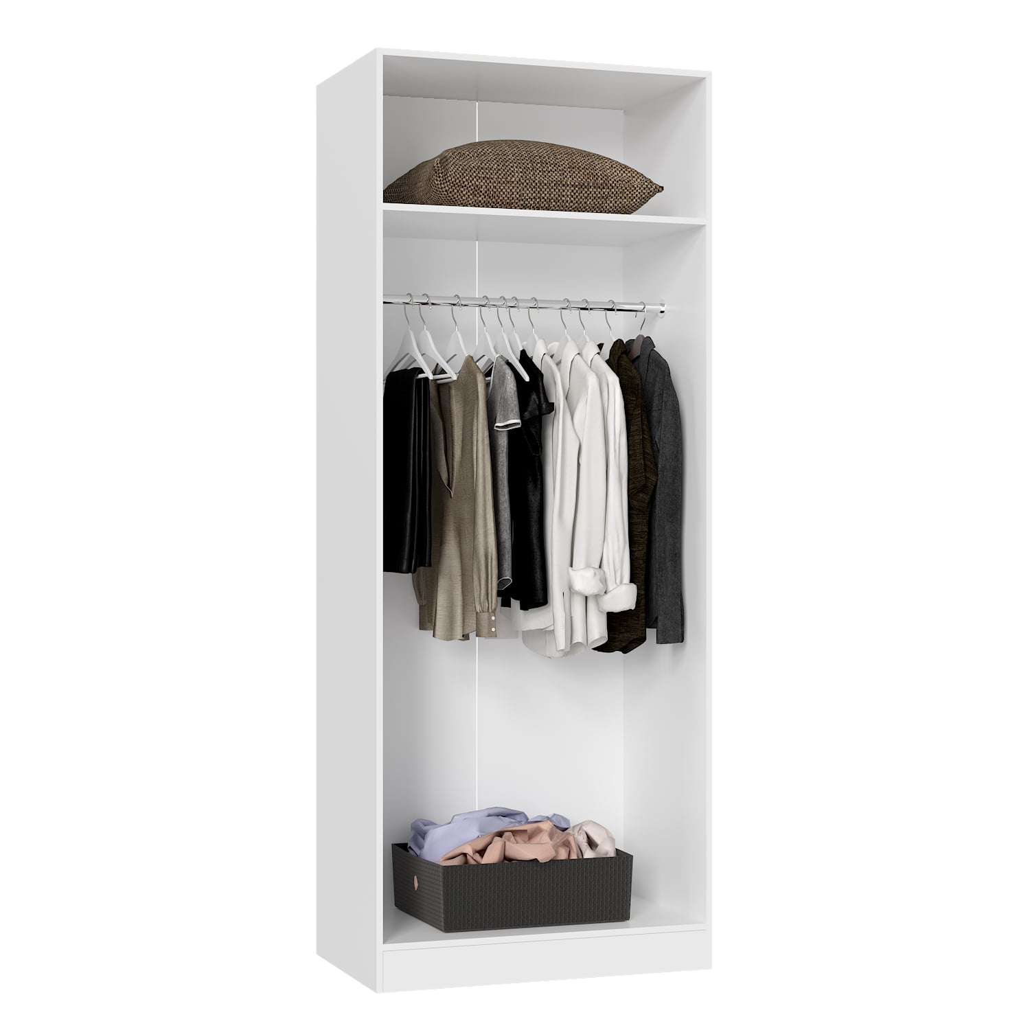 Шкаф оснащен двумя дверями, что обеспечивает удобный доступ к содержимому. Внутри шкафа предусмотрена штанга для размещения одежды на вешалках и полка для хранения аксессуаров и других вещей.