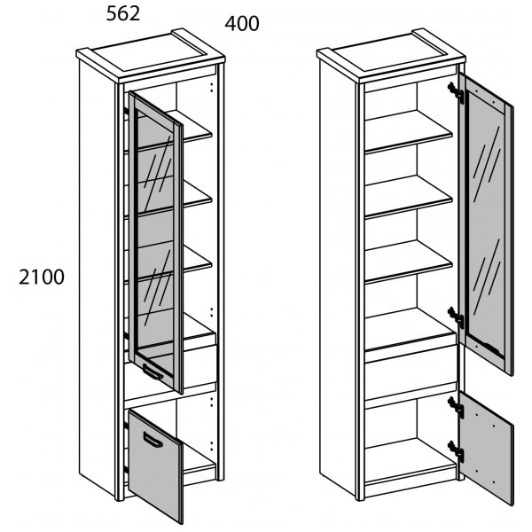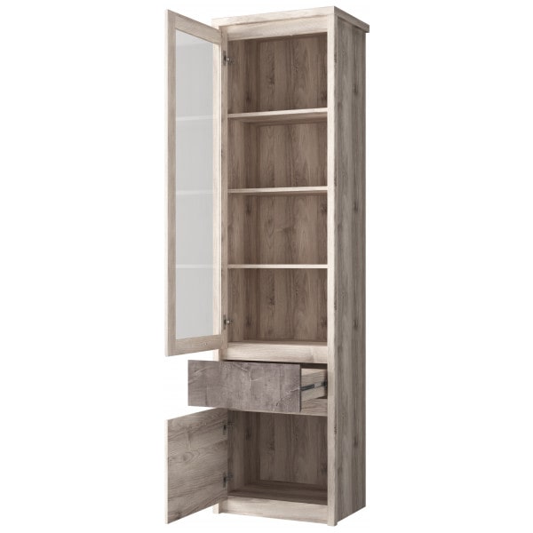 Шкаф с витриной 1V1D1S – изящный акцент в современном интерьере гостиной. Элемент можно установить, как отдельный предмет мебели, так и в композиции с другими модулями коллекции JAZZ. Шкаф с витриной 1V1D1S имеет прямую конструкцию. Конструкция элемента представляет собой одно отделение с полками из ЛДСП за витриной (1V), одну нишу за глухой дверью (1D), один выдвижной ящик (1S). Дверь и витрина распашные, крепятся на петли к боковому корпусу.