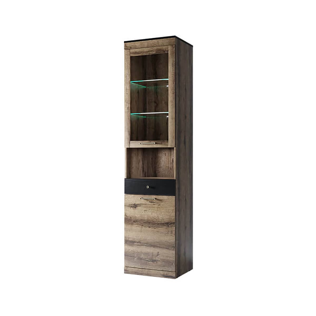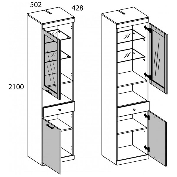 Шкаф с витриной JAGGER 1V1D1SN. Такой элемент обязательно подчеркнёт уникальность интерьера гостиной. Шкаф с витриной 1V1D1SN имеет прямую конструкцию. Конструкция элемента представляет собой одно отделение с полками из закалённого стекла за витриной (1V), одну открытую нишу (N), один выдвижной ящик (1S), отделение с покой из ЛДСП за глухой дверью (1D). Витрина и дверь - распашные, крепятся на петли к боковому корпусу изделия. Такой элемент организует компактное хранение декора, памятных вещей, книг, фото, документов и посуды.