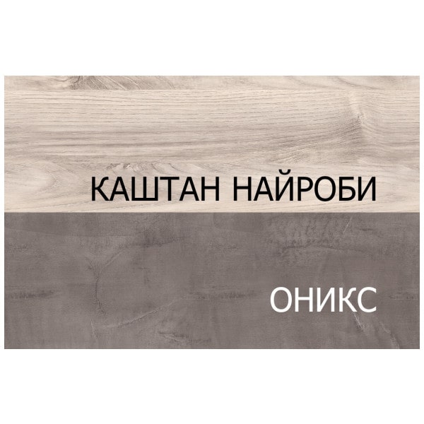 Материал: ЛДСП – 16 мм, цвет – каштан найроби 578 WML (распашные фасады и планки в витринах), ЛДСП – 16 мм, цвет – оникс 817 OS (фасад выдвижного ящика), закалённое стекло – 4 мм в рамке ЛДСП (витрина).