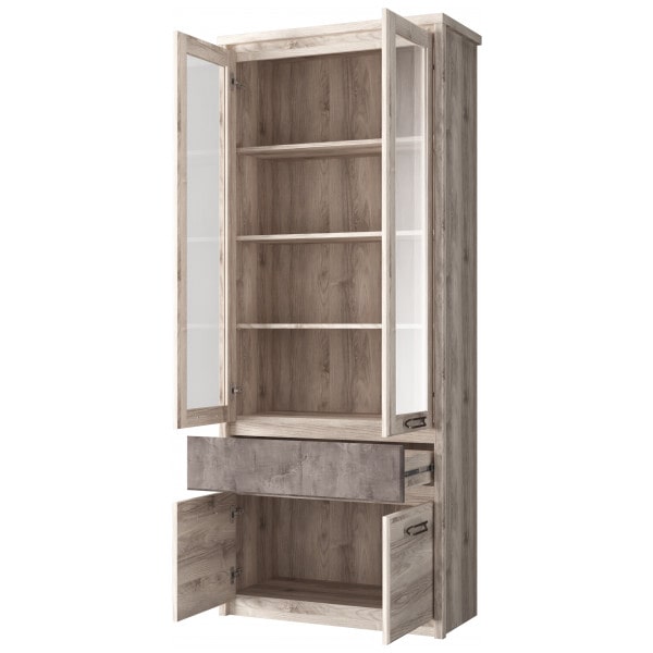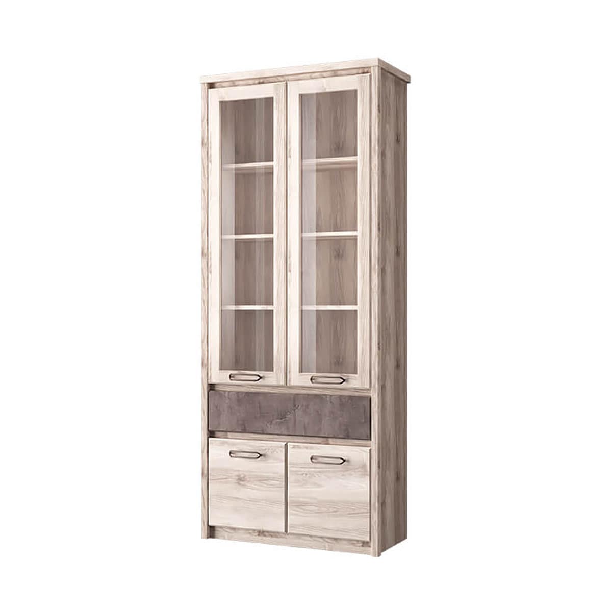 Шкаф с витриной 2V2D1S JAZZ – достойное украшение интерьера гостиной. Данный предмет организует хранение декора, книг, памятных вещей, оригинальных сувениров и красивой посуды, скатертей, салфеток и других вещей. Шкаф с витриной 2V2D1S имеет прямую конструкцию. Конструкция элемента представляет собой одно отделение с полками из ЛДСП за двумя витринами (2V), одно отделение с вместительными нишами за двумя глухими дверями (2D), один выдвижной ящик (1S). Витрины и двери распашные, крепятся на петли к боковому корпусу изделия.