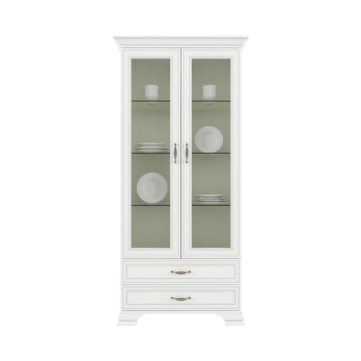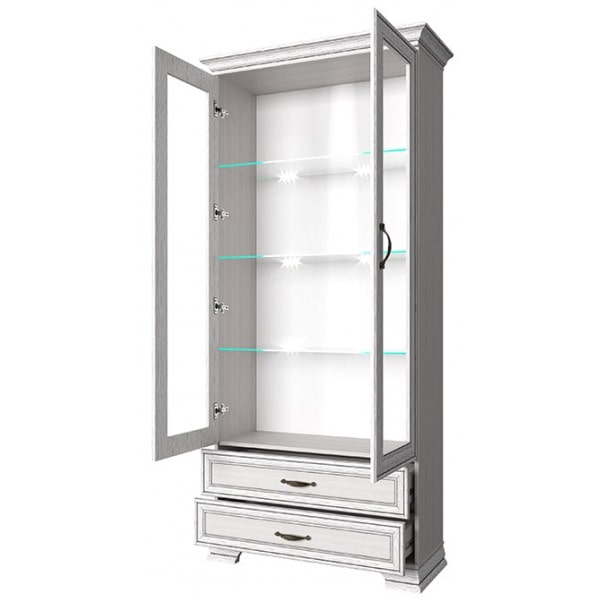 Шкаф с витриной Тиффани 2V2S. Такой предмет мебели, как шкаф с витриной 2V2S коллекции Тиффани, придаст интерьеру гостиной и столовой лёгкости и изящности. Шкаф с витриной 2V2S прямой. Представлена дополнительная комодная секция – два выдвижных ящика (2S). Конструкция элемента представляет собой одно отделение с полками из закалённого стекла (6 мм) за двумя витринами (2V – закалённое стекло – 4 мм) для хранения предметов декора, памятных вещей, книг, посуды. Выдвижные ящики организуют хранение журналов, столовых приборов, скатертей и салфеток. Витрины распашные, крепятся на петли к боковому корпусу.