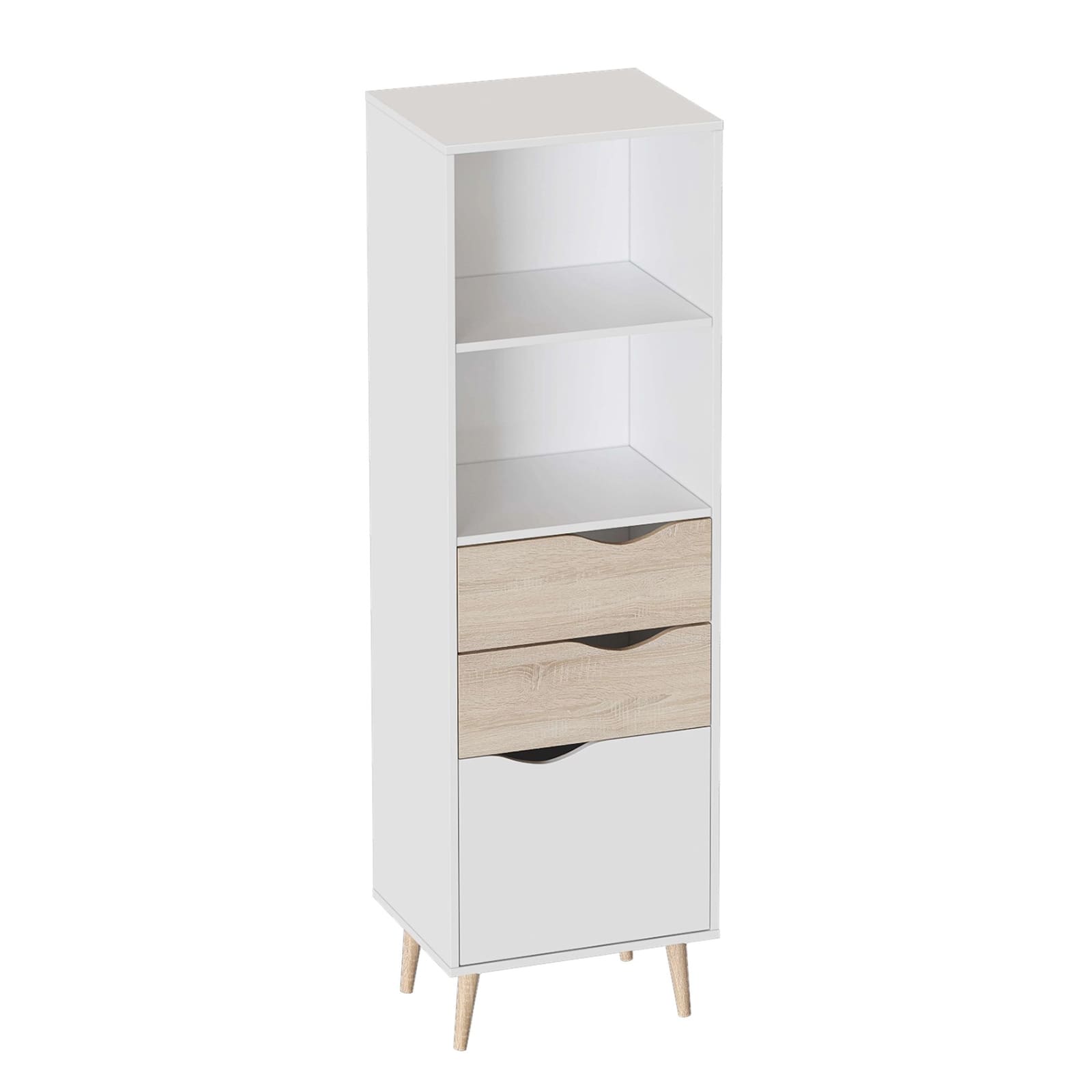 Шкаф-стеллаж «Соната» прекрасно впишется в любой интерьер и будет отлично смотреться как в составе мебельной композиции, так и отдельно. Этот шкаф с непроходными боковыми стенками состоит из двух отделений. Верхнее отделение оснащено открытой полкой, а в нижнем расположены два выдвижных ящика с прорезными ручками цвета «дуб сонома» и распашная дверца.