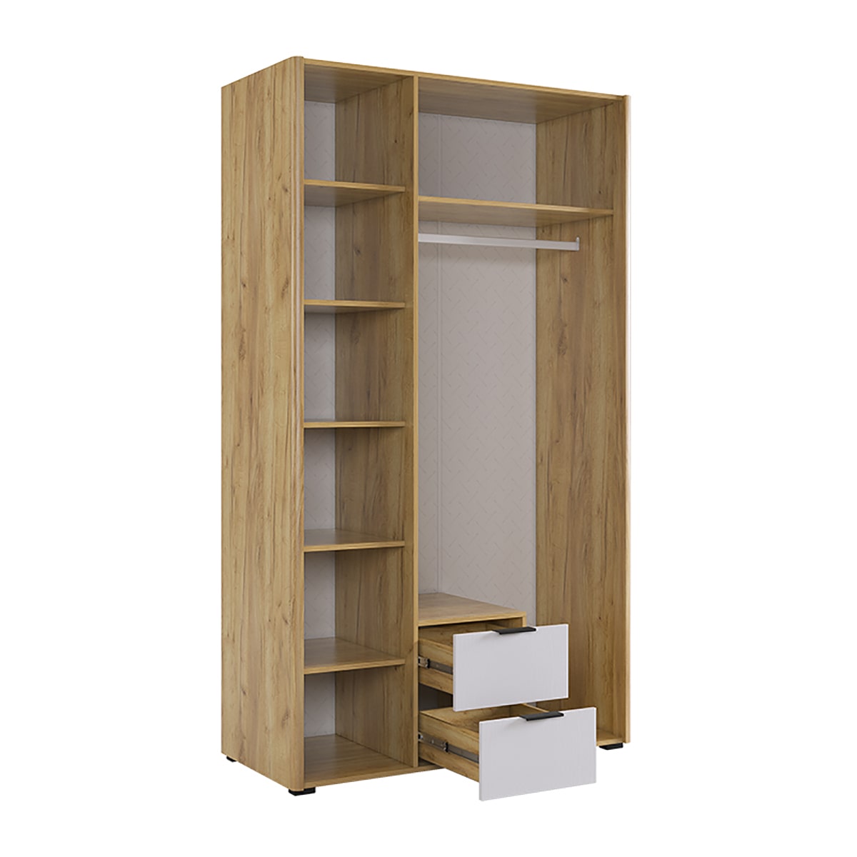 Вместительный шкаф имеет полки, ящики выдвижные и штангу для одежды, а полукруглые, обтекаемые углы обеспечат безопасность и комфорт.