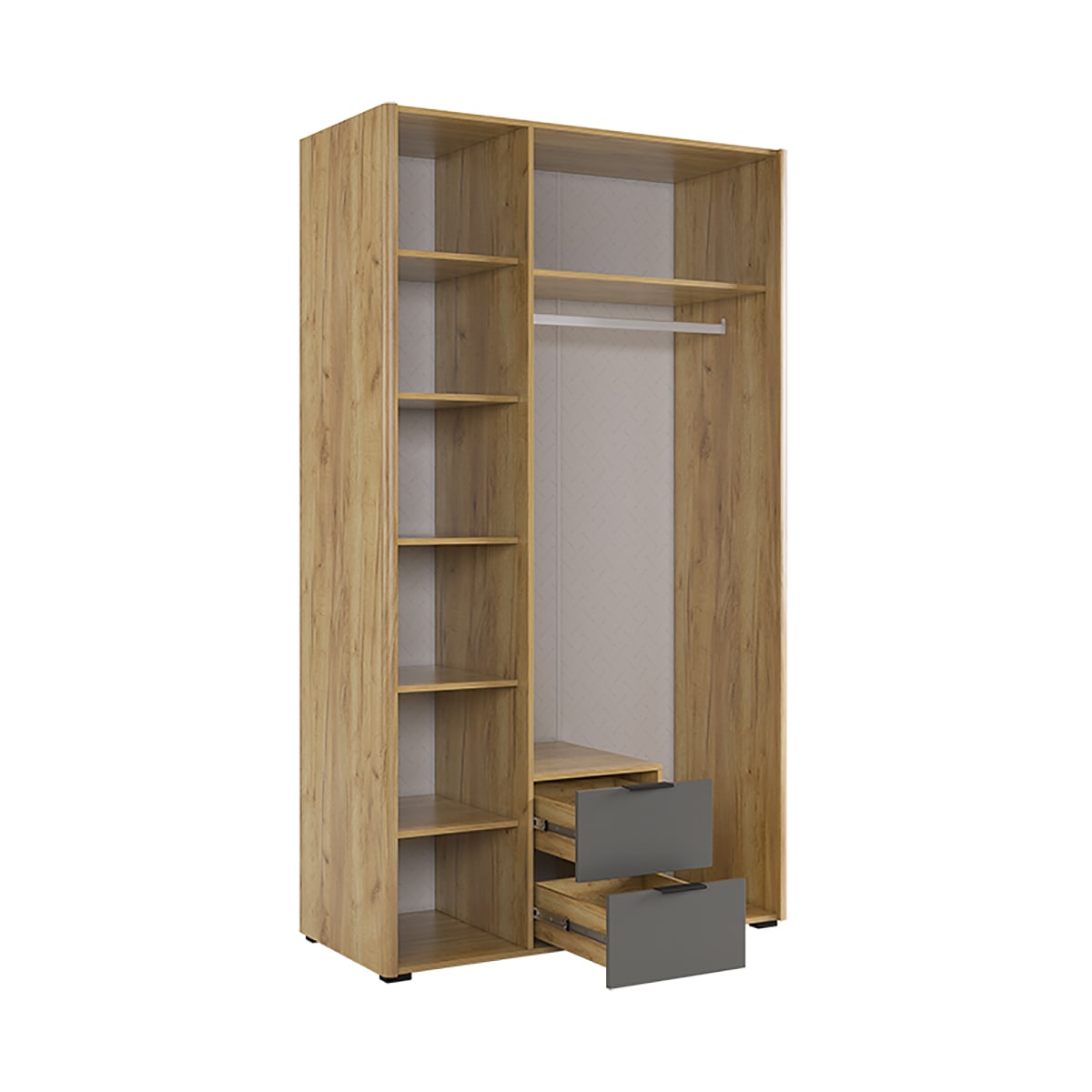 Вместительный шкаф имеет полки, ящики выдвижные и штангу для одежды, а полукруглые, обтекаемые углы обеспечат безопасность и комфорт.