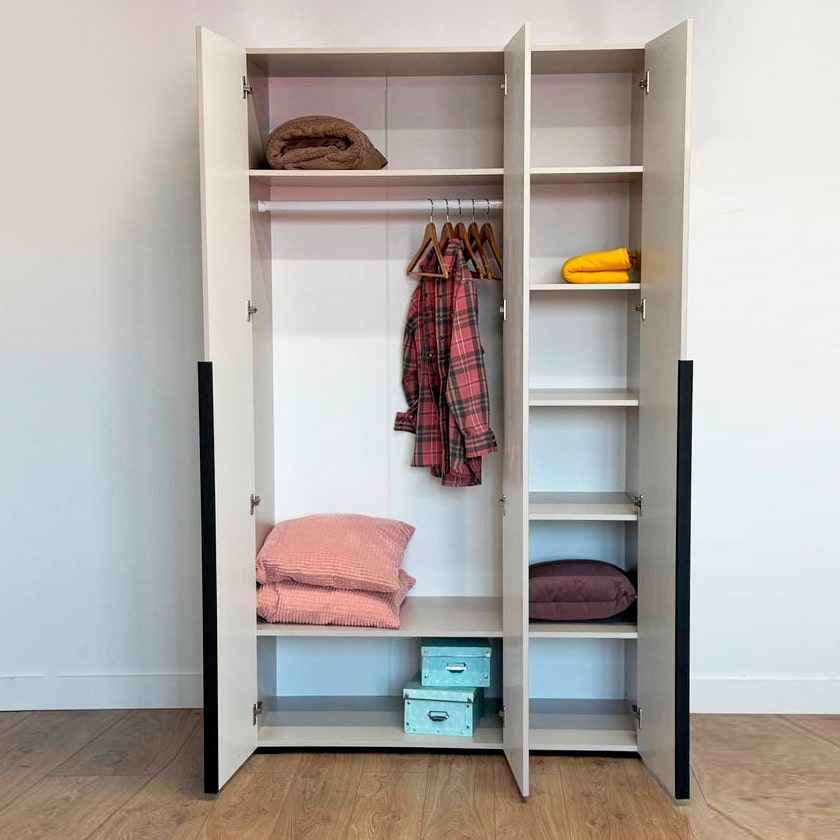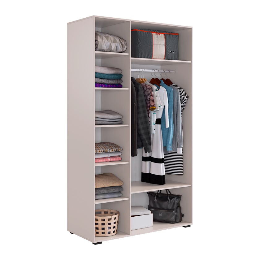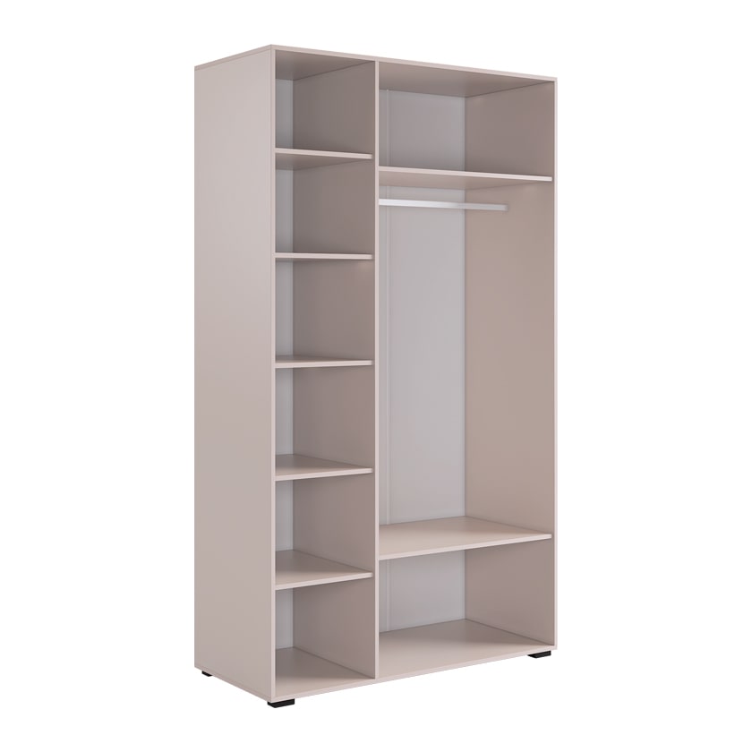 Шкаф имеет удобное наполнение: слева расположены полки для хранения вещей, а справа - штанга для вешалок. Это позволяет рационально использовать пространство и разместить различные типы одежды.