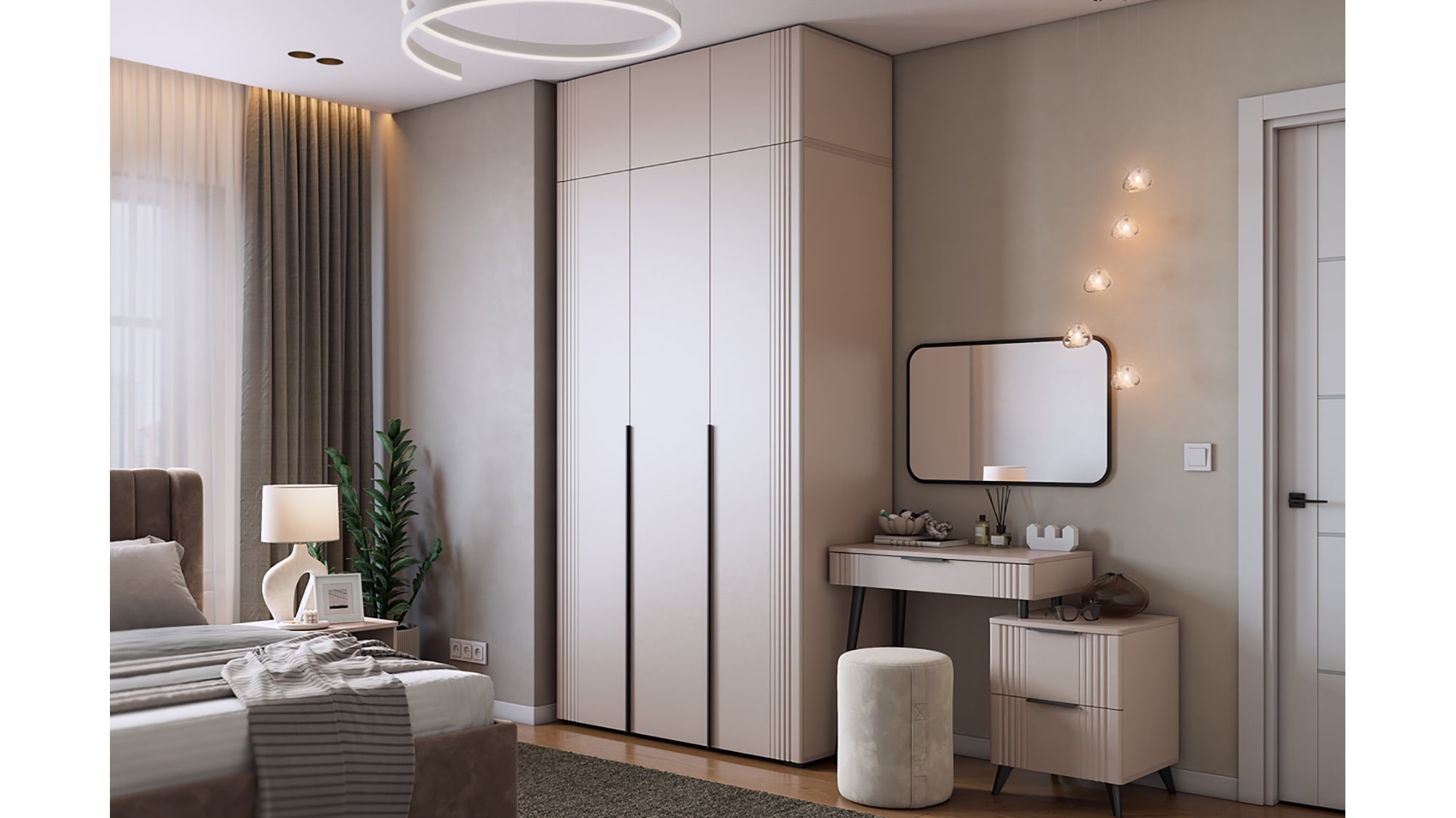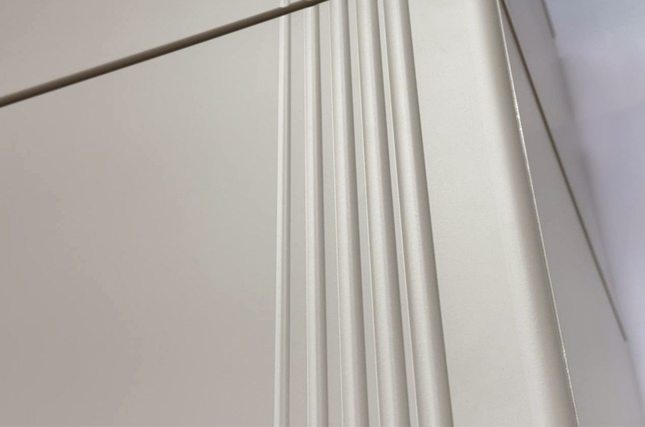 Особое внимание стоит уделить фрезеровке фасадов, которая придаёт шкафу изысканный и неповторимый вид. Длинные пластиковые ручки гармонично дополняют общий стиль шкафа.