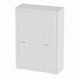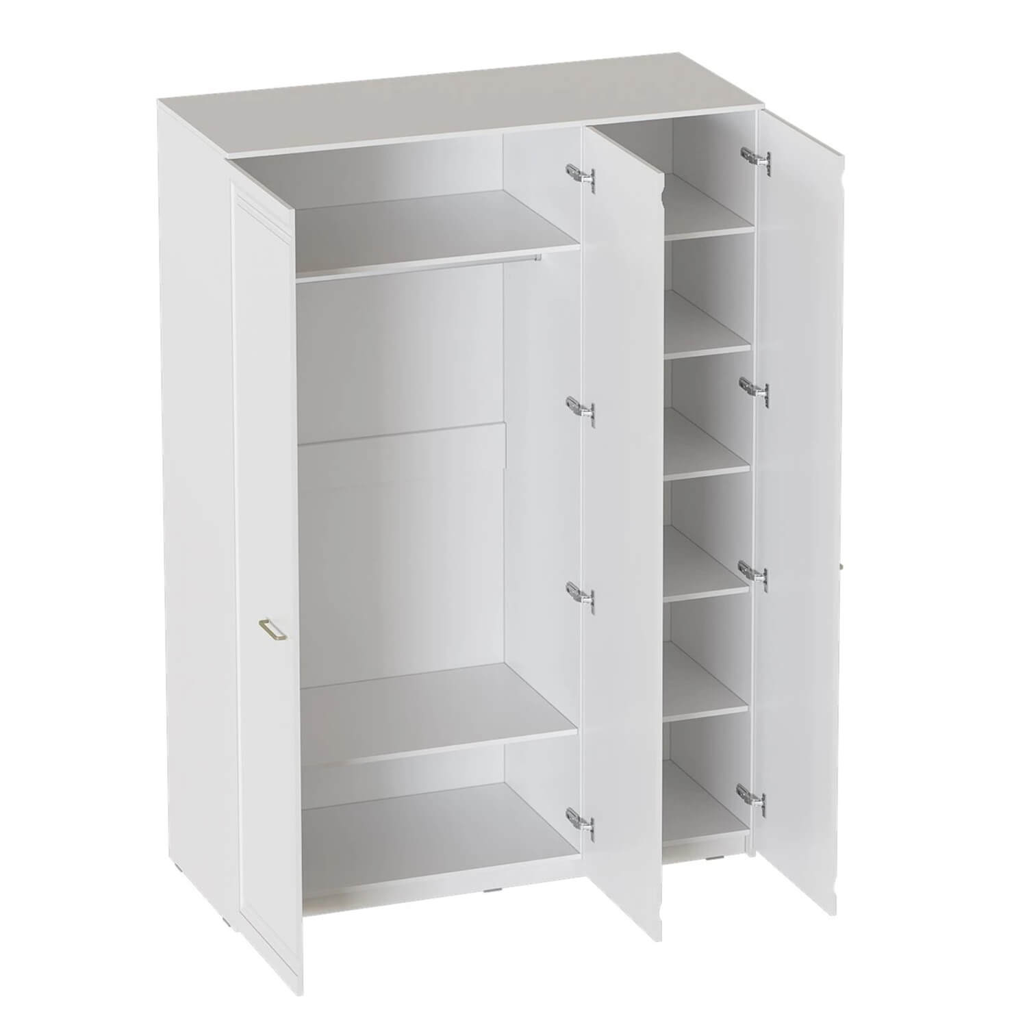 Шкаф выполнен в цвете Айс 06 / Белый Аляска. Классическая фрезеровка фасадов и ручки-скобы из брашированного золота придают изделию особый шарм и элегантность. Внутреннее пространство шкафа разделено на два отделения: слева находится отделение для одежды с одной большой стационарной полкой, одной большой съёмной полкой и продольной металлической штангой; справа находится отделение с одной небольшой стационарной полкой и четырьмя съёмными полками. Двери шкафа оснащены петлями с амортизаторами.