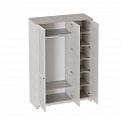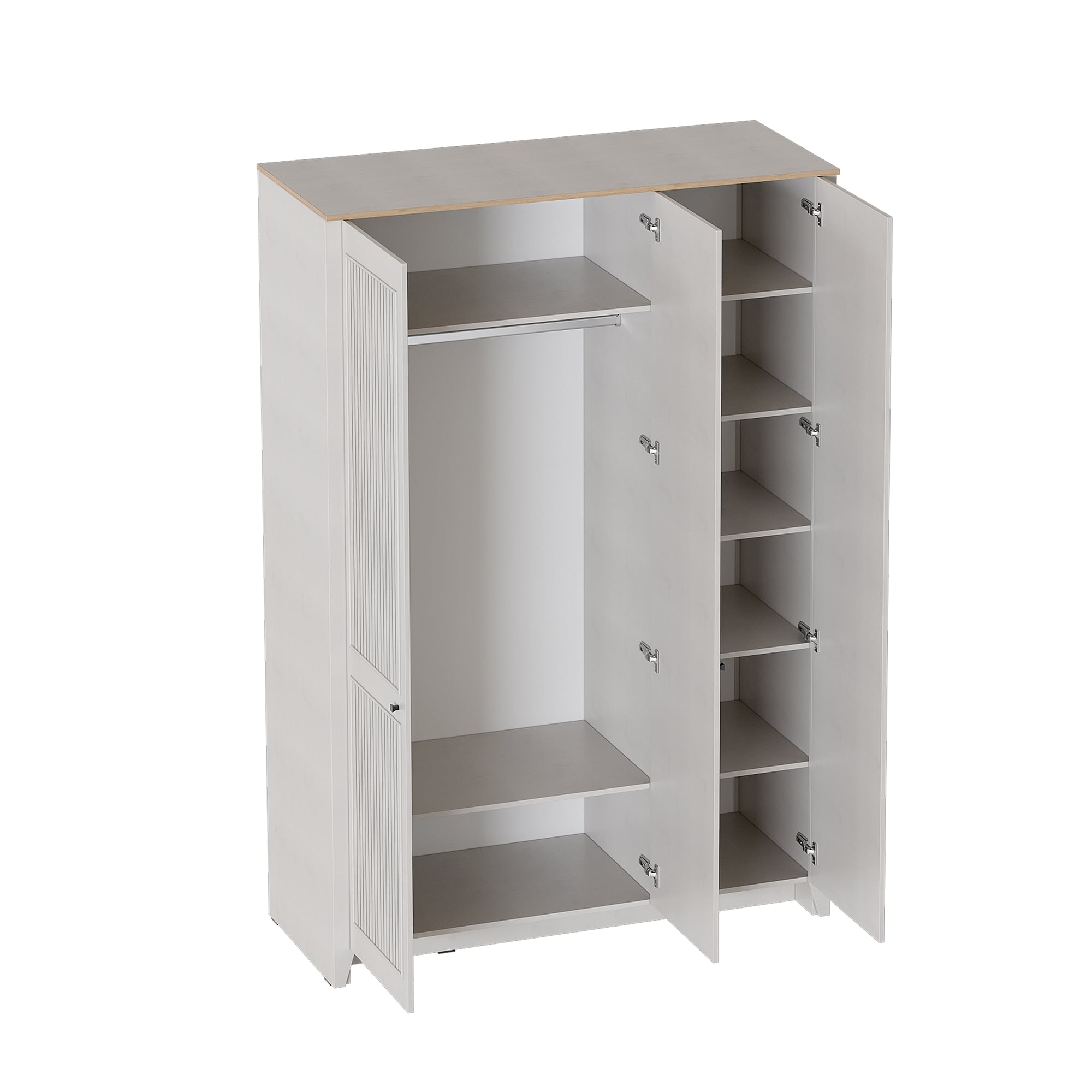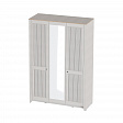 УФ-фотопечать полосок на фасадах в обрамлении пластиковых молдингов придает изделию оригинальный стиль современной классики. В центральной части шкафа расположена штанга для одежды, а также верхняя и нижняя полки, каждая из которых разделена на два отделения. Правая и левая части шкафа имеют по пять полок высотой 332 мм каждая. Задняя стенка шкафа изготовлена из ХДФ. На опорах размещены войлочные подпятники. Высота опор 104 мм. Зеркало выполнено с фацетом.