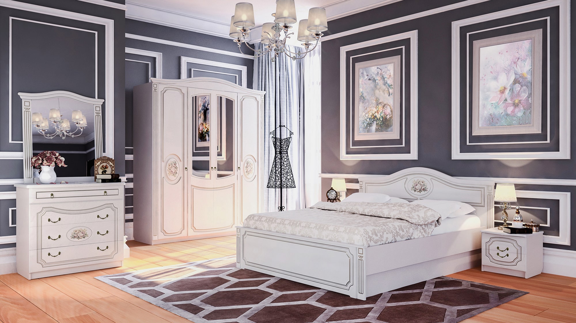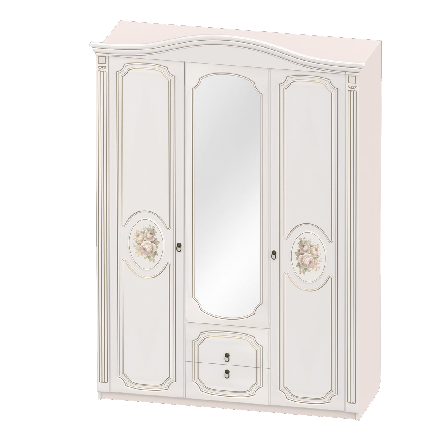 Фасады мебели декорированы элегантной фрезеровкой с эффектом патины и медальоном, на котором изображены розы. Для удобства использования дверцы и ящики оснащены темными металлическими ручками, имитирующими ковку.