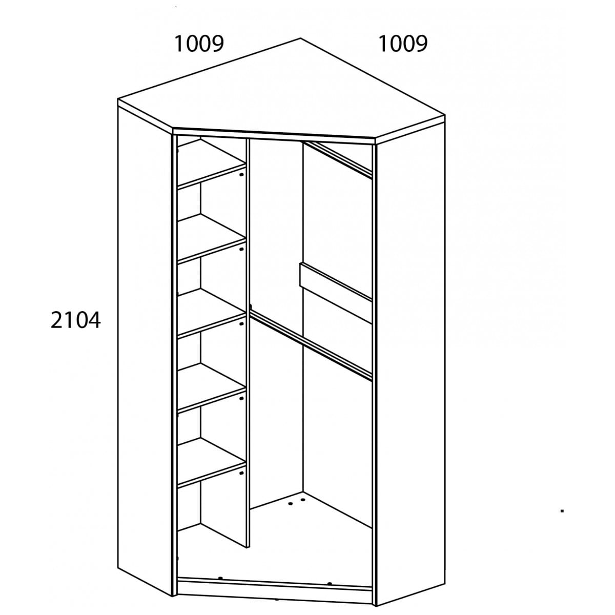 Шкаф угловой DIESEL 2D – предмет мебели, который организует удобное хранение вещей, стильно сконструирует интерьер комнаты. Шкаф угловой DIESEL 2D имеет угловую пятиугольную конструкцию. Конструкция элемента представляет собой гардеробное отделение с двумя штангами, отделение с полками из ЛДСП за двумя глухими дверями (2D). Двери распашные, крепятся на петли к боковому корпусу изделия.