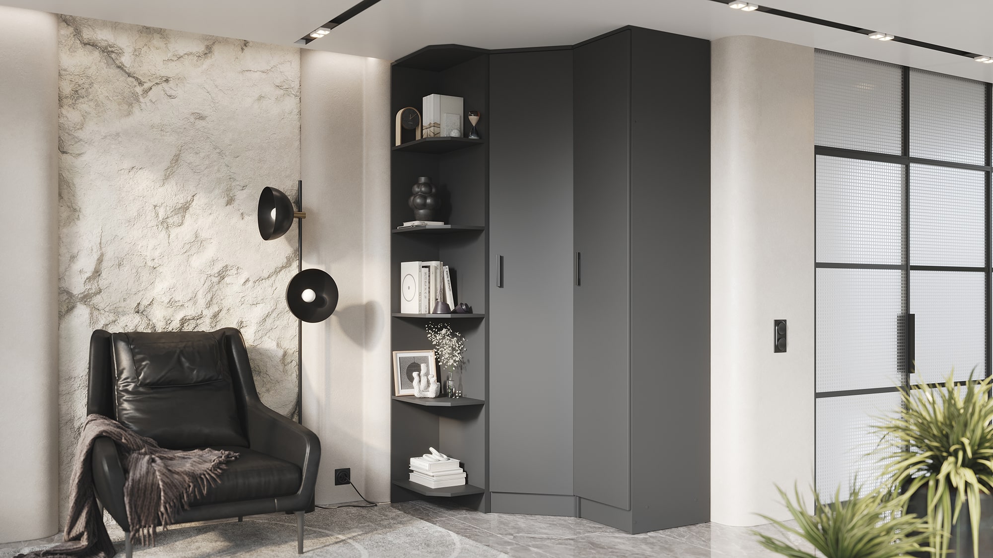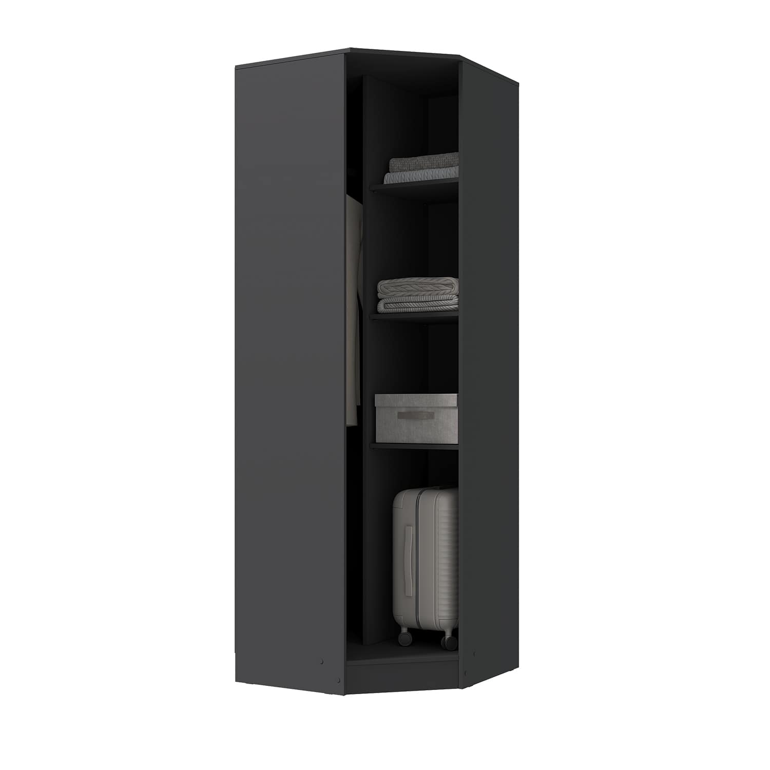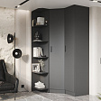 Угловая конструкция шкафа позволяет максимально эффективно использовать пространство в комнате, обеспечивая компактное и функциональное обустройство помещения любого размера.
