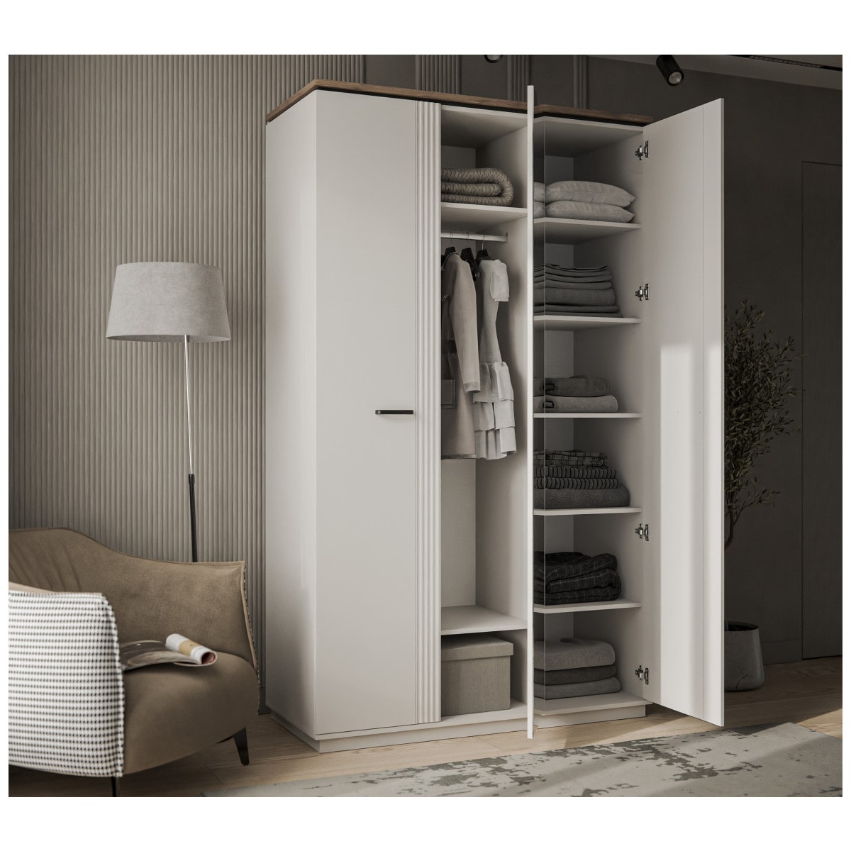 Декор в виде рифленой поверхности на фасаде подчеркивает особенность дизайна коллекции. Добавьте сюда подсветку, украсьте памятными сувенирами, семейными фотографиями и Ваш интерьер засияет поистине новыми красками.
