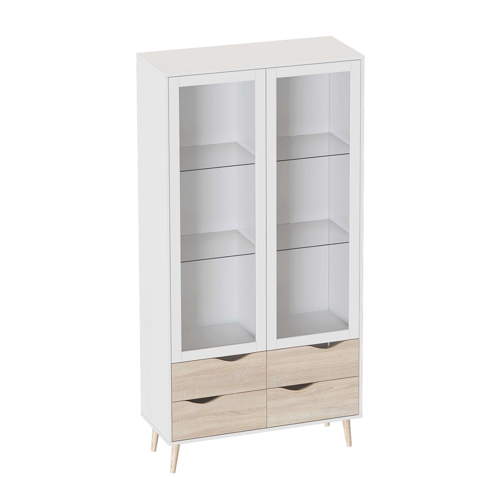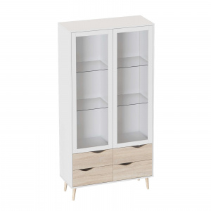 Шкаф-витрина «Соната» идеально впишется в любой интерьер и будет отлично смотреться как в составе мебельного ансамбля, так и отдельно. Благодаря распашным дверцам со стеклянными вставками и белым фасадам из ЛДСП, ваша коллекция фарфора, декоративные тарелки или книги будут защищены от пыли, а их содержимое будет легко просматриваться. В нижнем отсеке с четырьмя выдвижными ящиками, украшенными прорезанными ручками, можно хранить предметы практического назначения.
