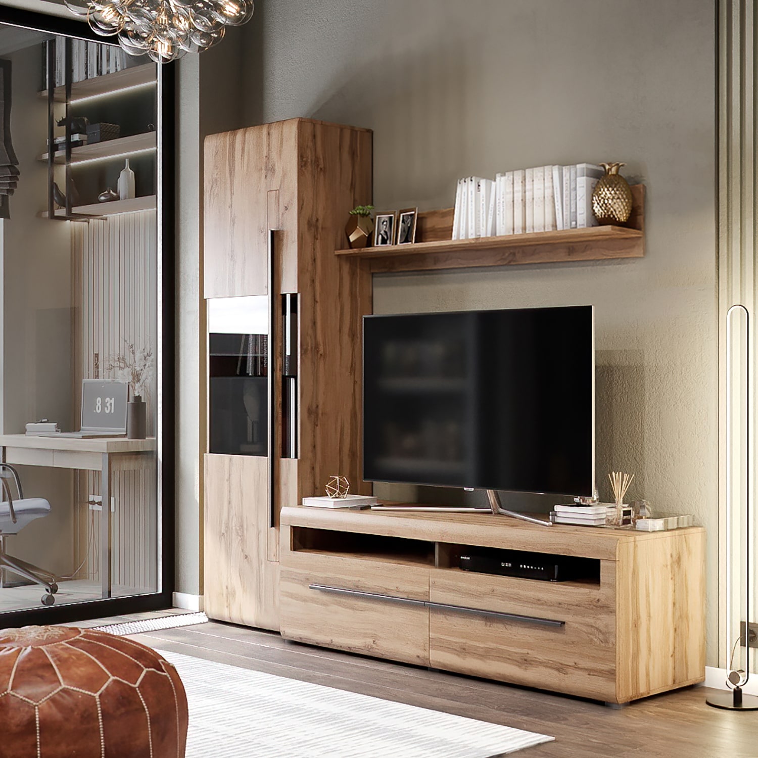 Внутреннее пространство шкафа разделено на три отсека, закрываемые одной общей дверью с затемненным стеклом. В верхнем и нижнем отделении расположено по одной стационарной полке. В среднем отделении расположена стеклянная съемная полка.
