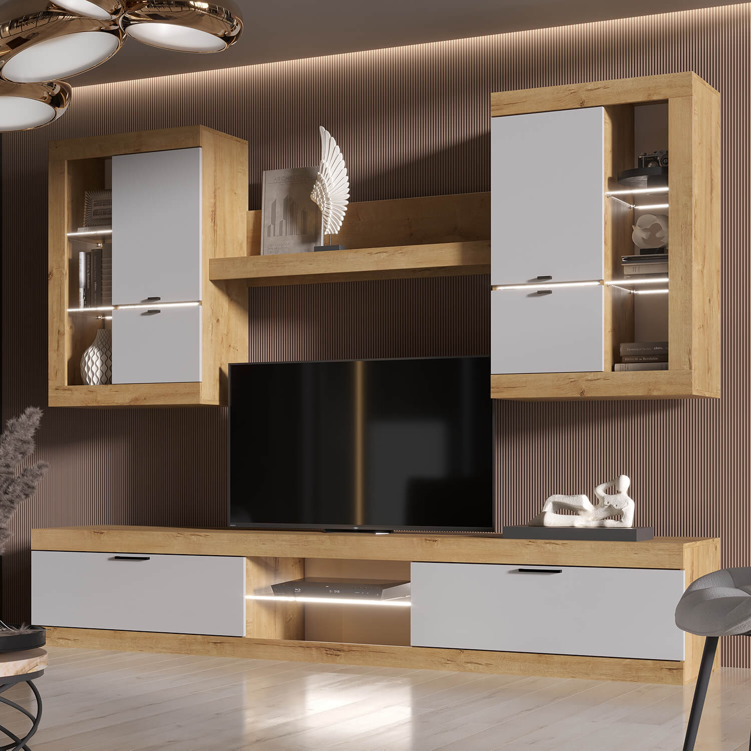 Гостиная Прага гармонично впишется в любой интерьер, а возможность подсветки создаст атмосферу комфорта.