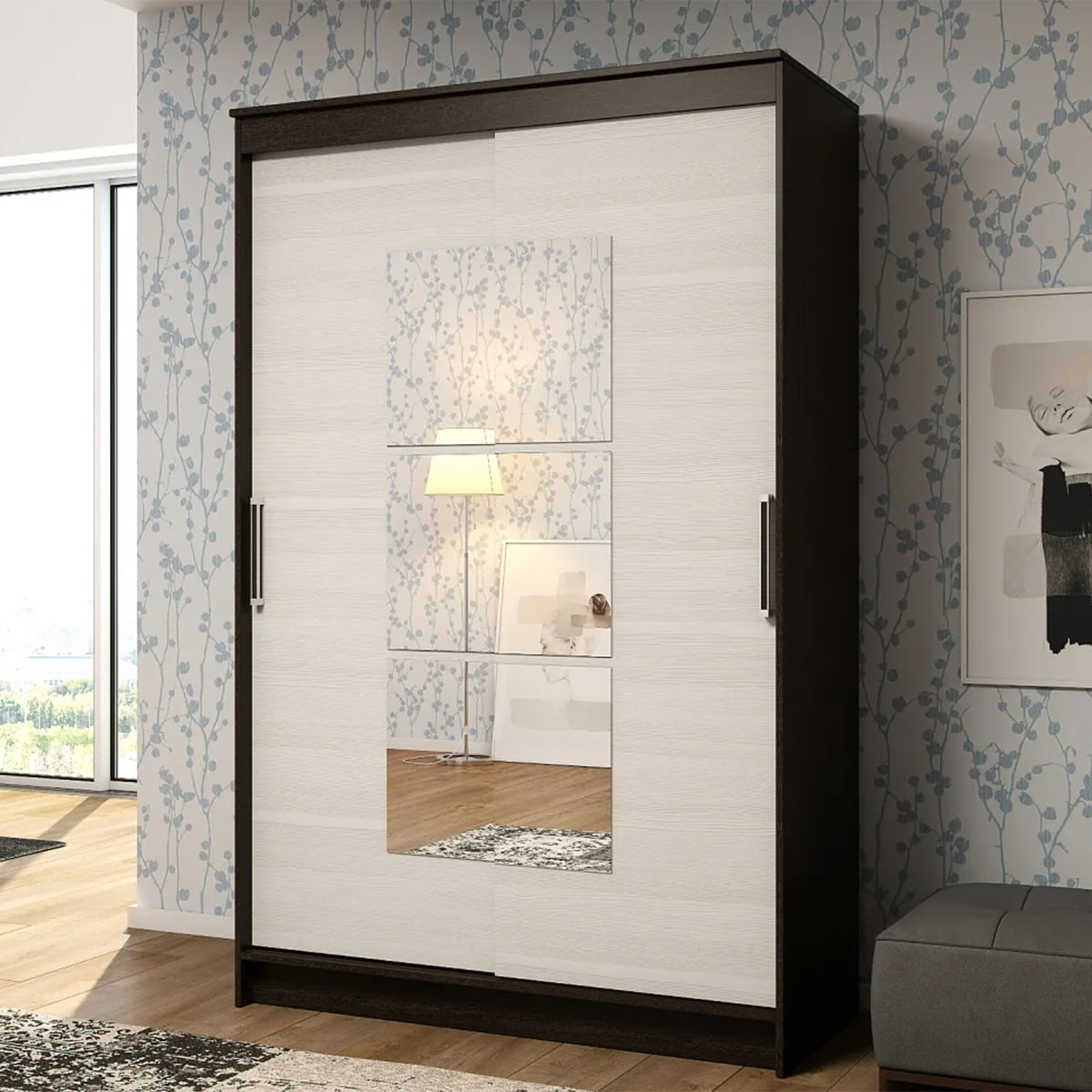 Особенностью шкафа является наличие зеркала на фасаде. Это не только визуально увеличивает пространство, но и добавляет изысканности в общий дизайн.