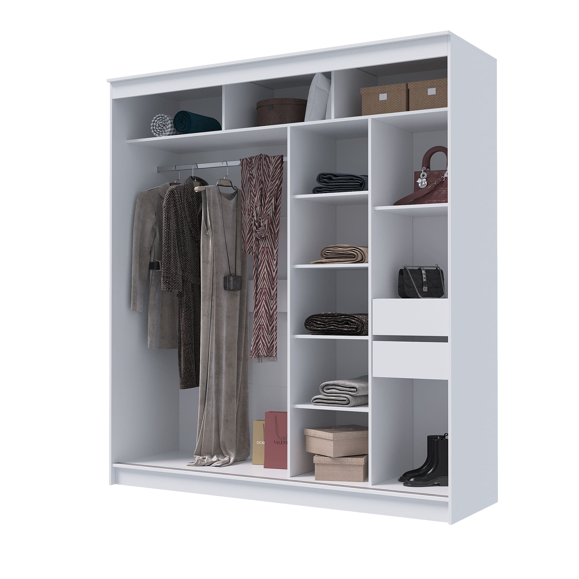 Настолько вместительный, что можно хранить не только одежду, но и различные бытовые вещи.