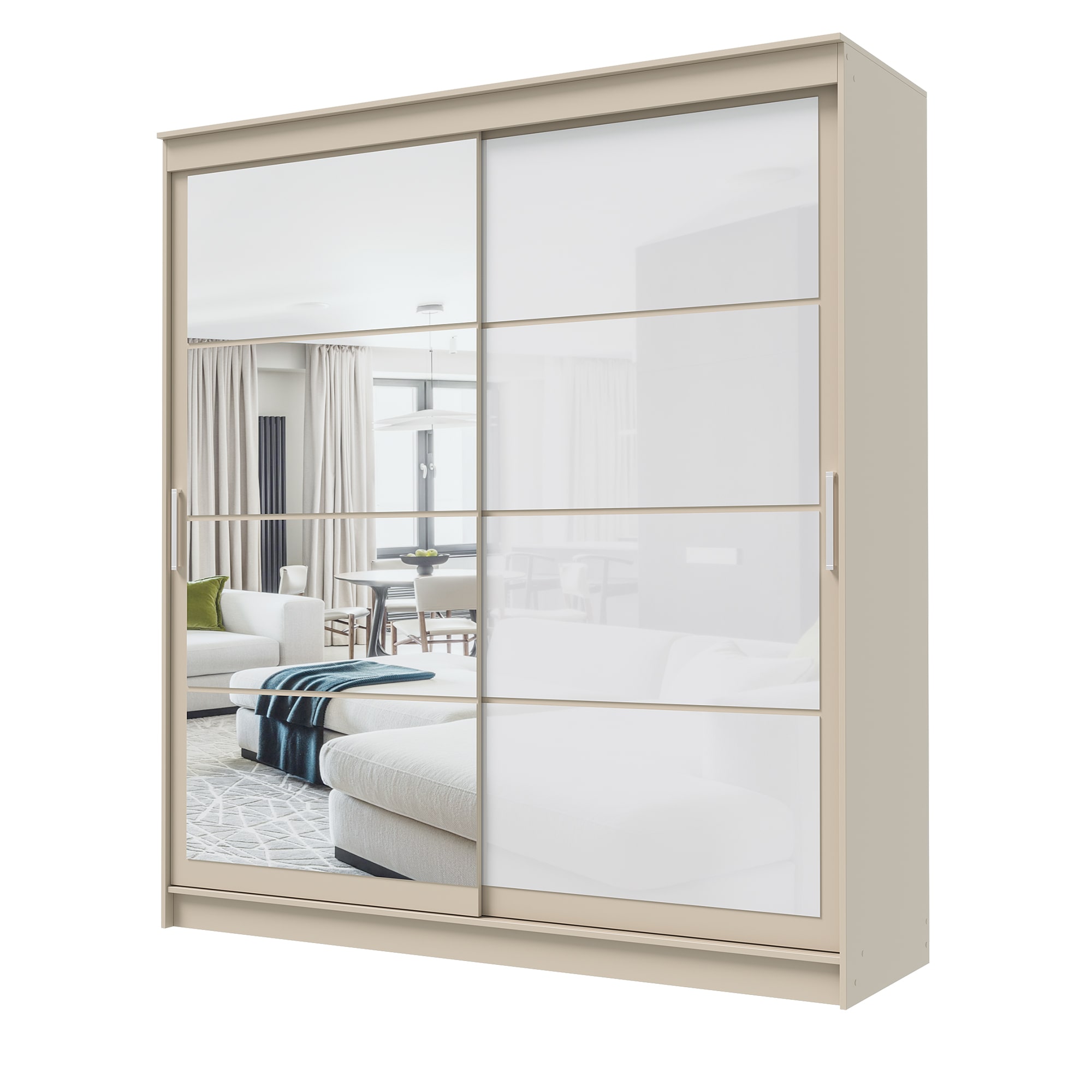 Шкаф-купе ГРАНД 1 2,0 Сатин/Зеркало/Лакобель белый доступен к заказу в различных вариантах исполнения цвета фасада и корпуса, среди которых каждый сможет найти подходящий своему интерьеру.