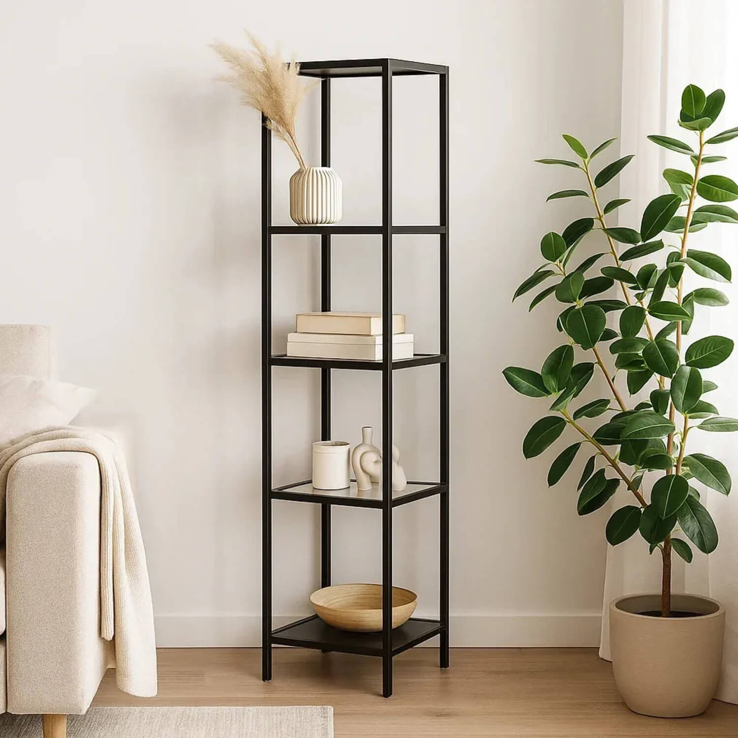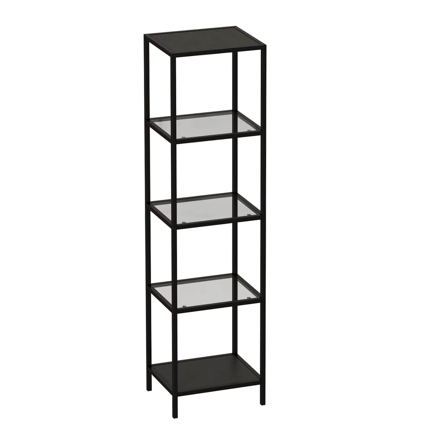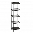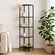 Стеллаж со стеклянными полками "Нора". Опорой для стеллажа служит черный металлокаркас. Верхняя и нижние полки металлические. Средние выполнены из прозрачного стекла толщиной 5 мм. Опоры регулируются по высоте. Предусмотрены отверстия для фиксации к стене.