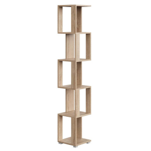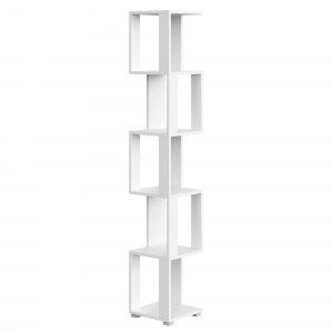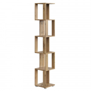 Стеллаж имеет 5 полок, что позволяет разместить на нем различные предметы: от книг и игрушек до растений. Открытая конструкция и угловая форма делают его удобным для зонирования пространства и создания уюта в помещении.