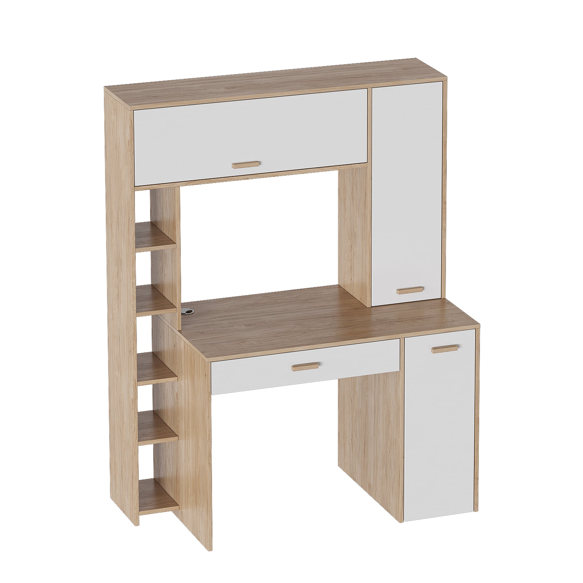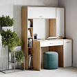 Внутреннее пространство стола включает три закрытые зоны: правая зона оборудована одной съёмной и тремя жёсткими полками, а левая представляет собой открытую нишу с полками. Верхняя часть разделена на две секции перегородкой, а под столешницей находится выдвижной ящик на шариковых направляющих.