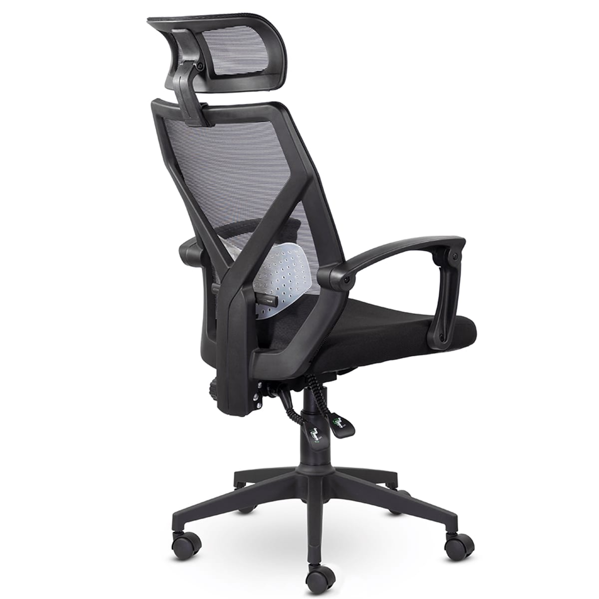 Кресло руководителя с уникальной системой трансформации подлокотников при активации механизма качания 1/3. Дополнительный комфорт в зоне поясницы сделан за счет регулируемой по высоте и глубине блока из прозрачного пластика. Изменение наклона и высоты подголовника способствует удобному расположению в кресле.
