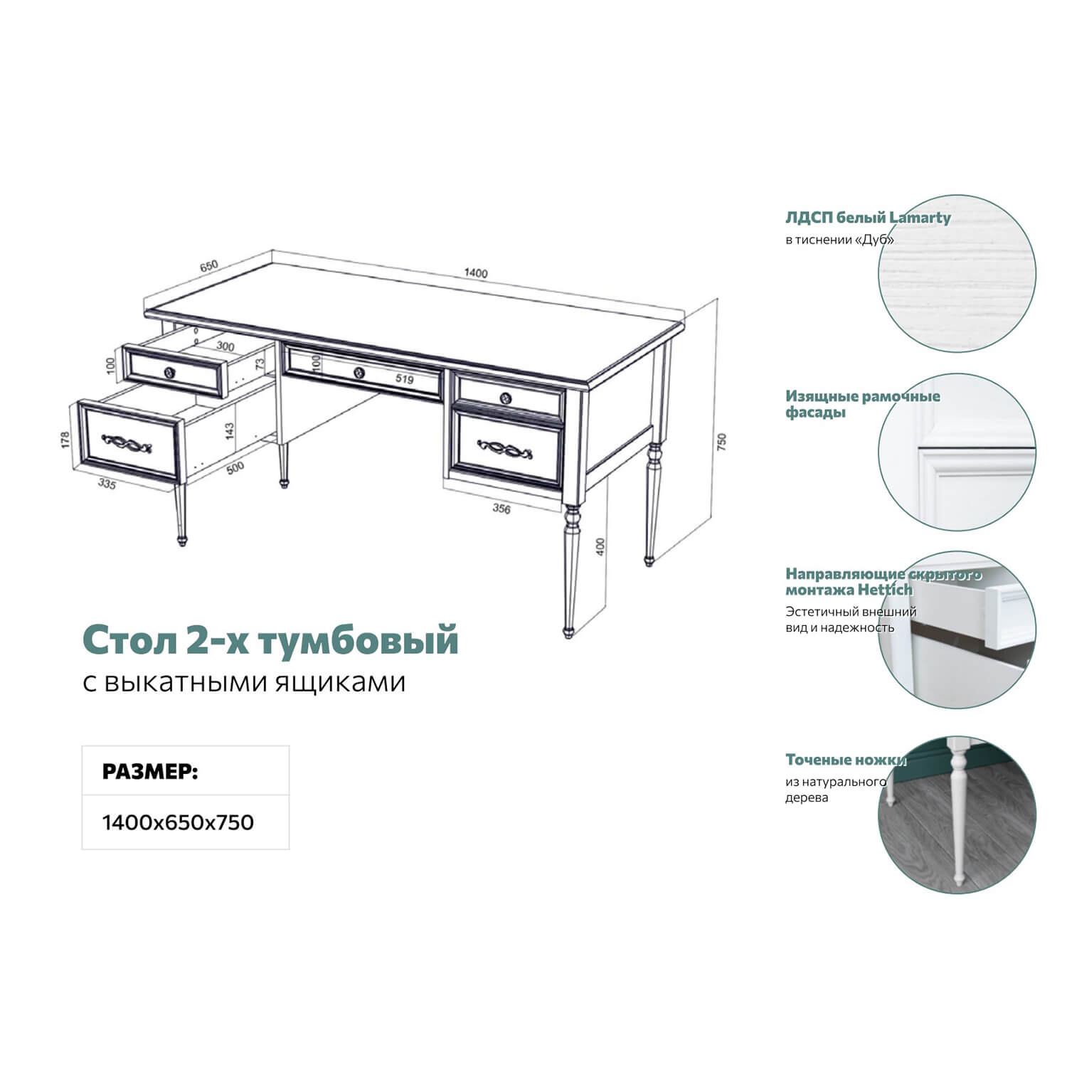 Корпус: ЛДСП 16 мм. Опоры: массив березы Фасады: рамочные. Рамка - МДФ в пленке, вставка - ЛДСП 10 мм. Фурнитура: Ручка скоба металлическая, Ручка кнопка металлическая. Направляющие шариковые полного выдвижения Столешница 1400х650 мм